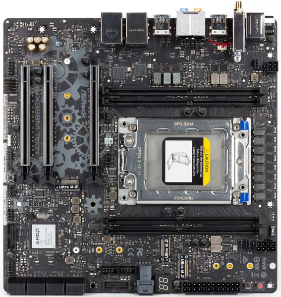 Система питания процессора основана на ШИМ-контроллере International Rectifier IR35201 и включает в себя 11 фаз: восемь для питания процессорных ядер и три для «периферии» SoC. Во всех (что привычно) используются интегрированные сборки Infineon Technologies IR3555M. Характеристики, конечно, не рекордные, но компактность платы и без того заставила инженеров активно использовать двухсторонний монтаж — все-таки сам по себе разъем процессора огромен. В любом случае, этого достаточно даже для 2990WX в штатном режиме, а «младшие» процессоры семейства можно и немного разогнать — без экстрима, который все равно плохо совместим с компактными системами.