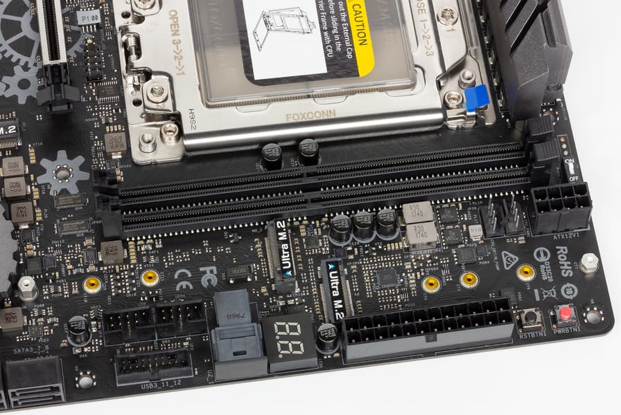 Три разъема M.2 предназначены для установки твердотельных накопителей и все поддерживают NVMe-накопители с интерфейсом PCIe 3.0 x4. Первый (с поддержкой плат 2242/2260/2280/22110) и второй (2242/2260/2280) ни с какими другими и не работают, а вот третий (для плат 2230/2242/2260/2280) — также допускает и установку устройств SATA600. Он использует встроенный в процессор контроллер, так что даже в данном случае не ограничивает количество доступных SATA-портов. Да и вообще единственное ограничение — при использовании разъема U.2 отключится первый слот M.2, что сложно считать такой уж весомой потерей, поскольку предназначены они для одного и того же.