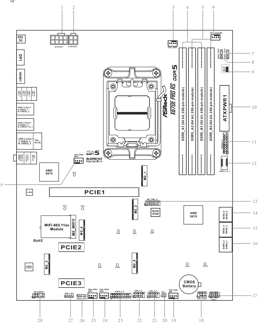 Форм-фактор ATX имеет размеры до 305×244 мм, а E-ATX — до 305×330 мм. Материнская плата ASRock X670E Pro RS имеет размеры 305×244 мм, поэтому выполнена в форм-факторе ATX, и на ней имеются 10 монтажных отверстий для установки в корпус.