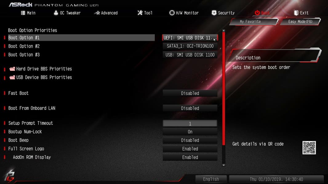 Пункт меню Boot дает нам обычный выбор накопителя и иные параметры загрузки.