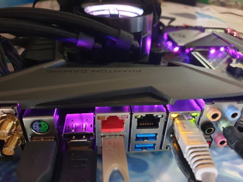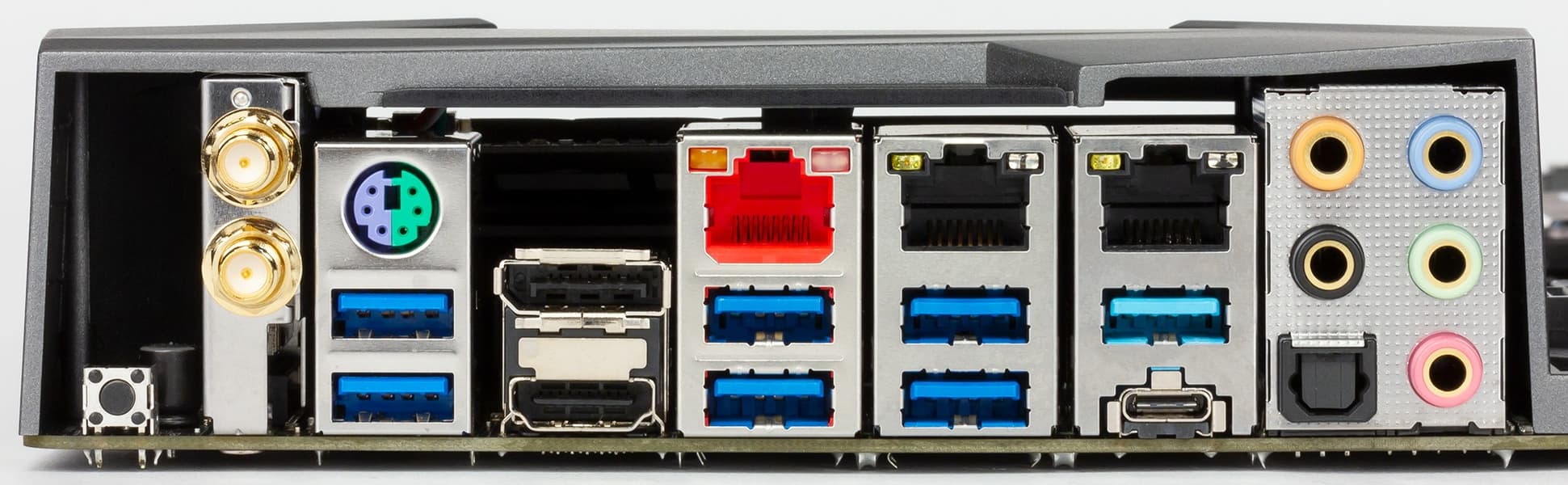 | Разъемы на задней панели | 1 × USB 3.1 (Type-C) 3 × USB 3.1 (Type-A) 4 × USB 3.0 3 × RJ-45 1 × PS/2 5 аудиоразъемов типа миниджек 1 × S/PDIF (оптический, выход) 1 × HDMI 1.4 1 × DisplayPort 1.2 2 антенных разъема 1 кнопка сброса CMOS |