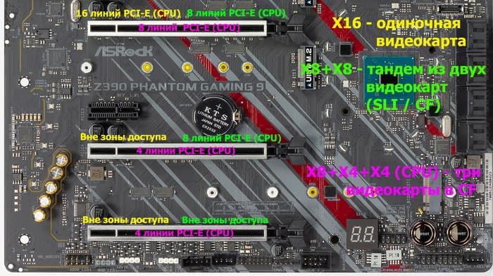 То есть полноценно получит 16 линий PCI-E только одиночная видеокарта, а «дуэт» из двух видеокарт в режиме SLI/CrossFire получит по 8 линий на каждый слот.