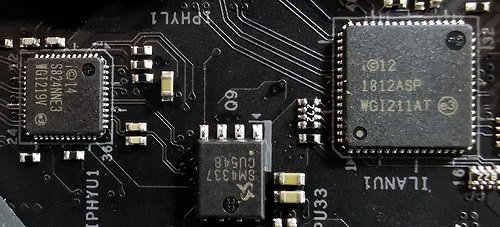 Поэтому инженеры решили использовать 2 фазы для iGPU как есть, а также применить 5 удвоителей фаз IR3598, установив их на обороте печатной платы. Суммарно они и обеспечивают 10 каналов для Vcore. Шестая микросхема IR3598 сконфигурирована как драйвер для GPU Voltage, поэтому на деле ШИМ-контроллер работает в режиме 5+2 фазы. За остальные два канала VCCIO и VCCSA отвечает контроллер Richtek RT8120. Использованы полевые транзисторы TI и Sinopower.