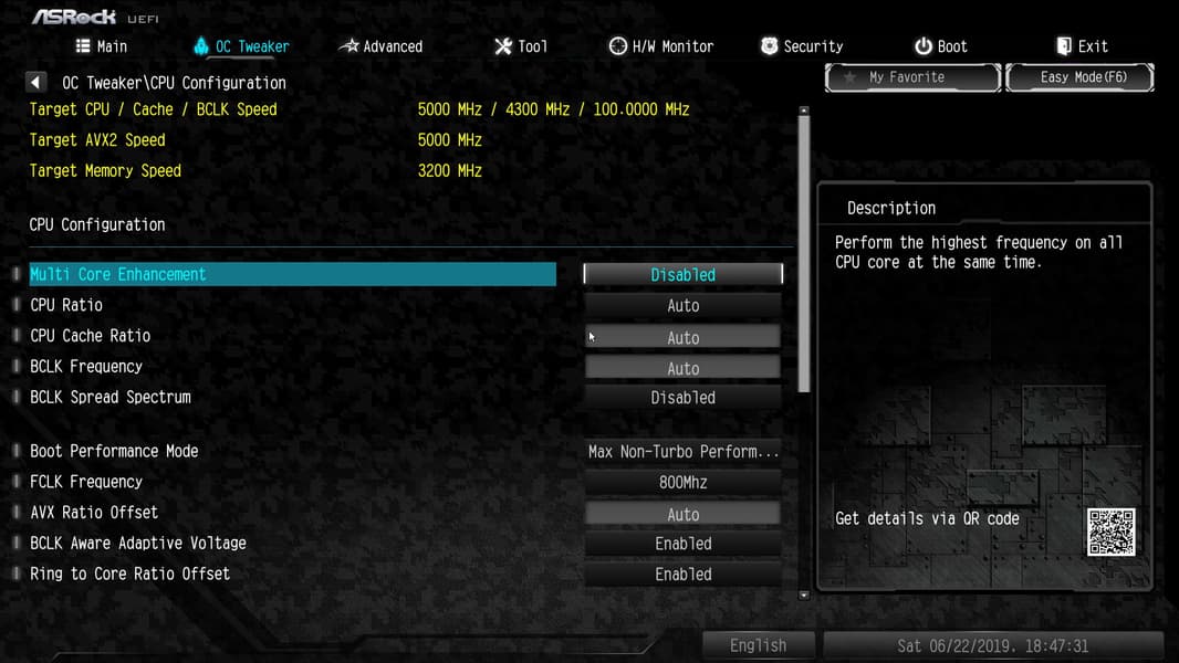При попытке войти в режим разгона — выдается жесткое «не поддерживается». При этом мы видим, что частота работы процессора i9-9900K поднята совсем на чуток: до 3900 МГц.