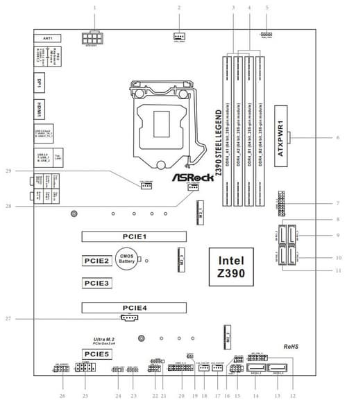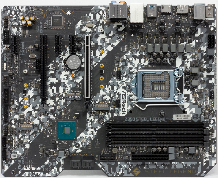 Как и все аналоги на Z390, ASRock Z390 Steel Legend поддерживает процессоры Intel Core 8-го и 9-го поколений, выполненные под разъем (сокет) LGA1151v2. Хотя физически отличий от старого LGA1151 нет, старые процессоры в LGA1151 v2 работать не будут. Поэтому еще раз напомню: только модели с индексами 8000 и 9000!
