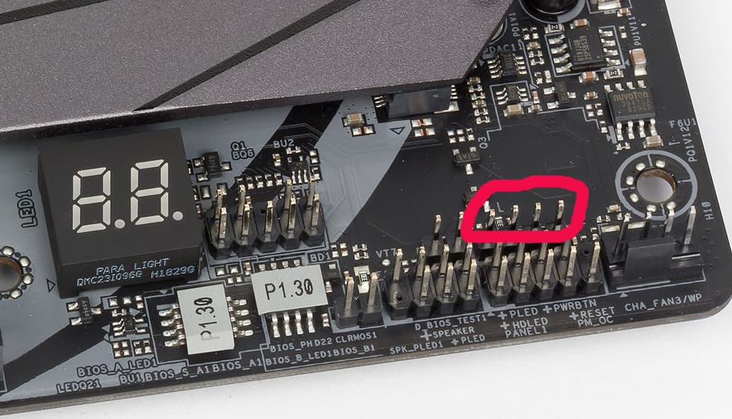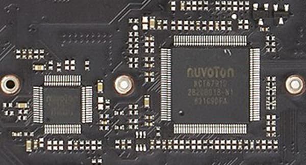 Да, и еще разъемы для подключения вентиляторов. Их на плате много — 8 штук. CPU_FAN1 предназначен для обычного воздушного кулера процессора, а CPU_FAN2 — для подключения мониторинга жидкостной системы охлаждения процессора. CHA_FAN1—6 поддерживают любые системы охлаждения корпуса, включая также и жидкостные (например, на видеокарте). Мониторинг этих разъемов, а также работу порта PS/2 обеспечивает I/O-контроллер Nuvoton, расположенный на обороте платы.