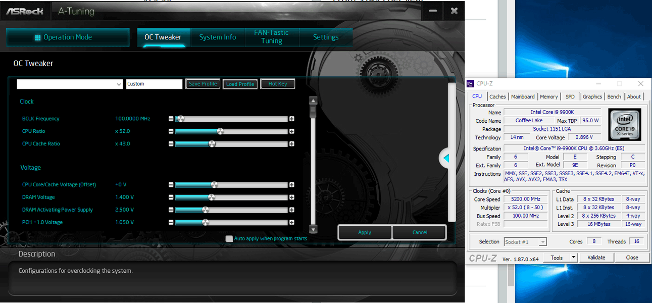 На данной плате Core i9-9900K легко «взял» частоту в 5 ГГц, при этом ничего не надо было менять или настраивать. А вот при желании поднять планку разгона еще выше как раз потребуется данная программа или же придется копаться вручную в настройках BIOS. Выше показано достижение частоты 5,2 ГГц, однако без принудительного поднятия напряжения система работала нестабильно. Стабильную работу на 5,2 ГГц (то есть при множителе 52, но при этом множитель кэша процессора поднять выше 43 не удалось) мы получили при повышении напряжения на 0,02 В. Можно было экспериментировать и дальше, однако статью уже пора заканчивать.