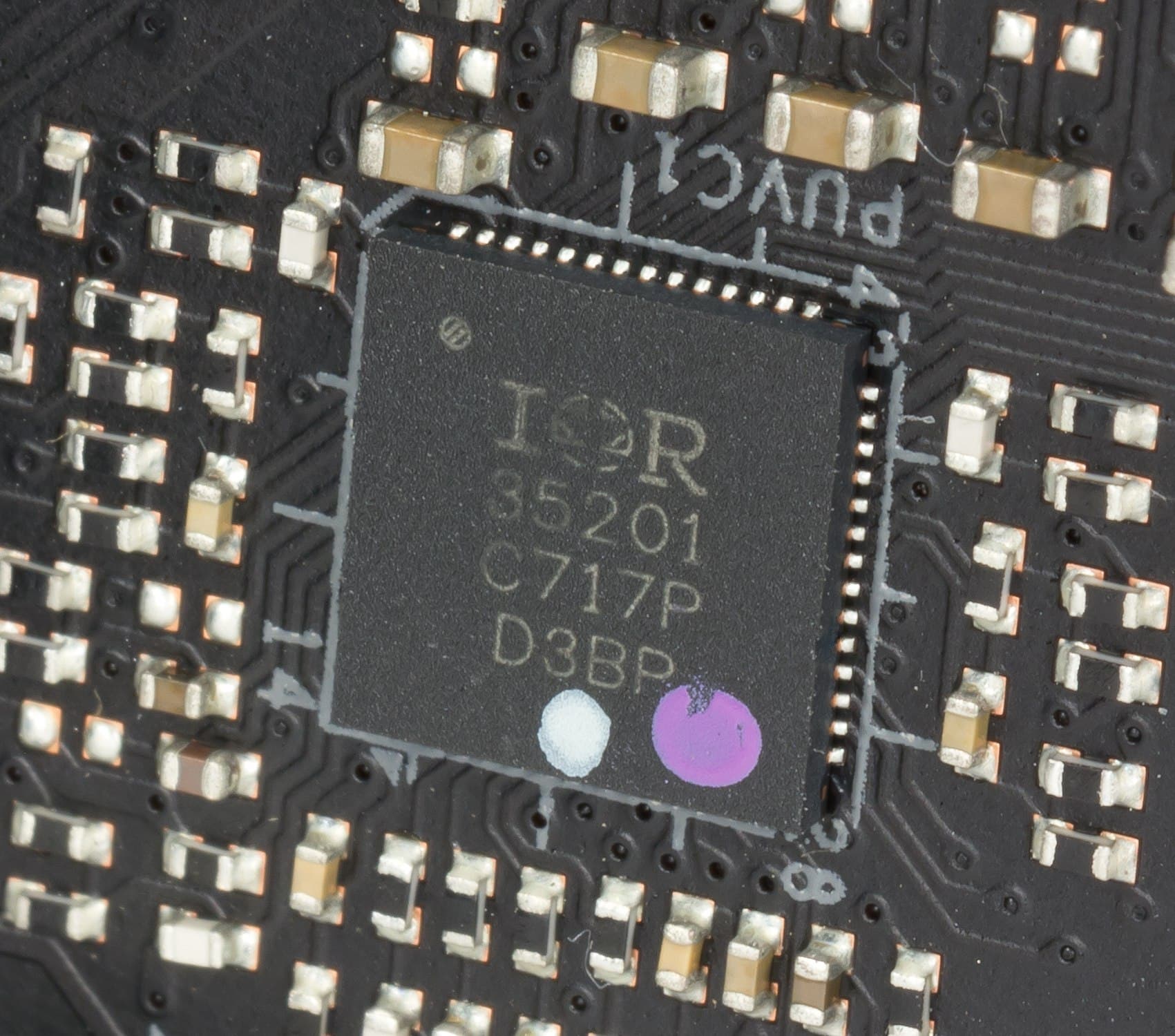 Очевидно наличие 14 каналов питания, из них 12 (10+2) относятся к VCore и iGPU, а остальные 2 — VCCIO и VCCSA. Однако установленный ШИМ-контроллер IR35201 (производства Infineon) поддерживает только 8 фаз.