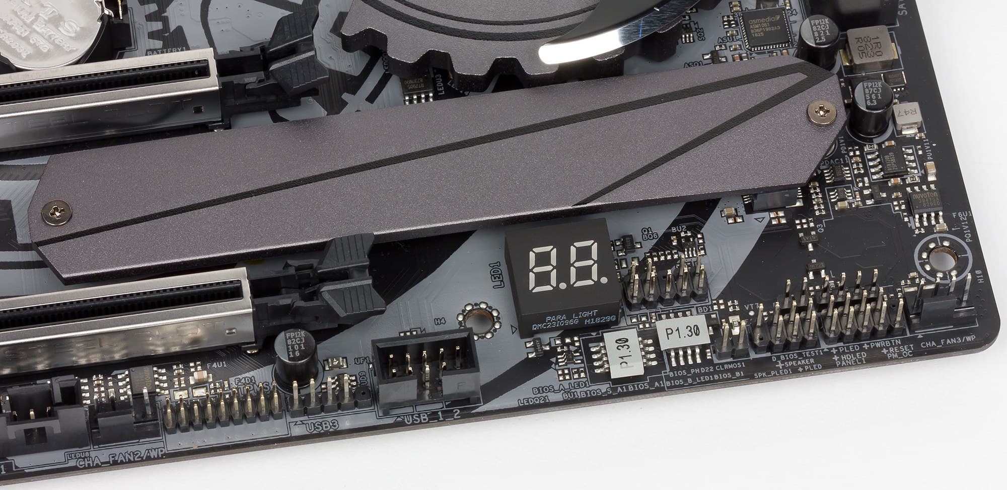 На фото выше можно заметить табло для отображения POST-кодов. Если некорректно вставить модули памяти или видеокарта как-то криво войдет, этот вариант диагностики может пригодиться... Если причиной проблем оказывается разгон, есть удобная кнопка очистки CMOS на задней панели, а также вторая копия UEFI (BIOS).