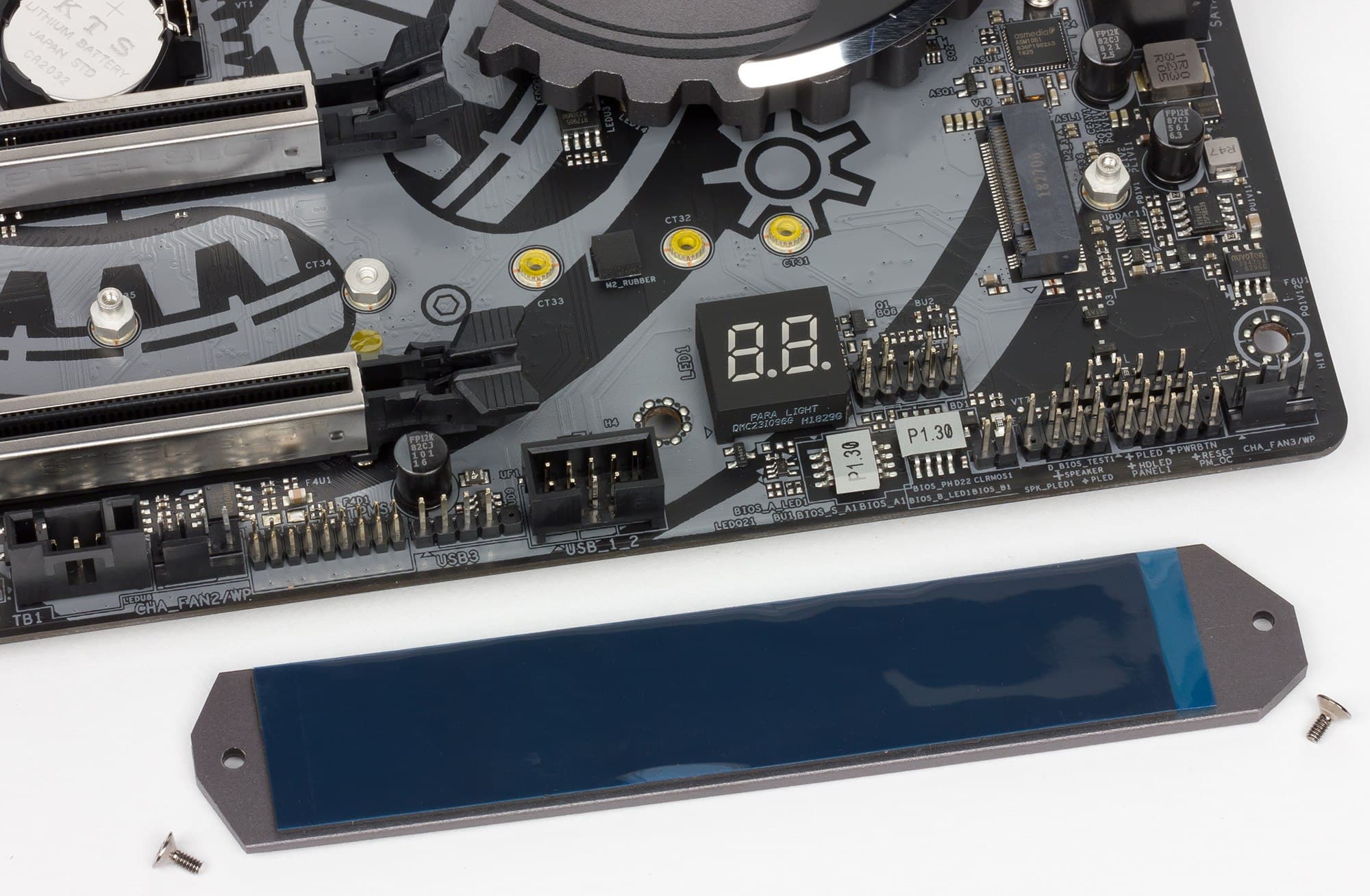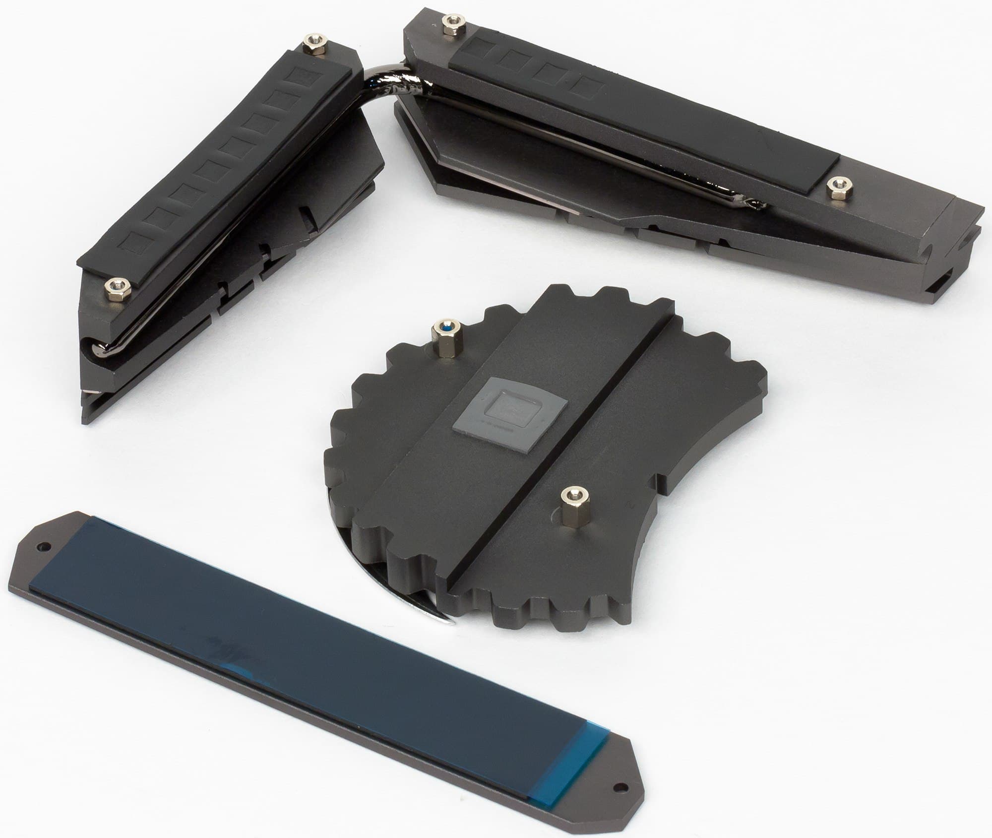 Последний элемент этого комплекта «охлади инь-ян, и процессор разгонится» — это уже упомянутый выше радиатор для нижнего слота M.2, снабженный термоинтерфейсом: вдруг установленный туда SSD перегреется и начнет троттлиться... Хотя верится в это с трудом.