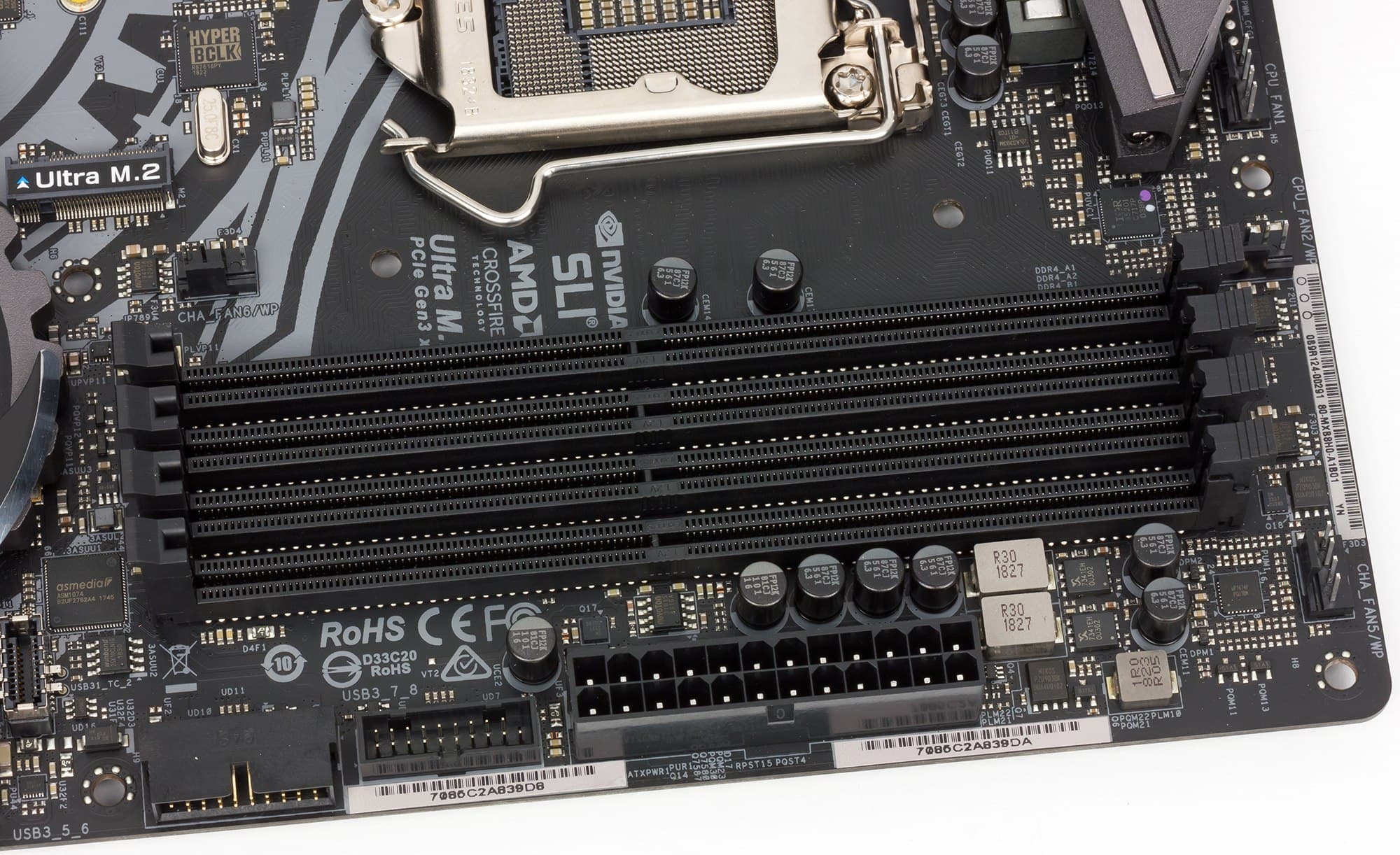 Для установки модулей памяти на плате имеется четыре DIMM-слота. Плата поддерживает небуферизованную память DDR4 (non-EСС), а максимальный объем памяти составляет 64 ГБ (при использовании модулей емкостью по 16 ГБ).