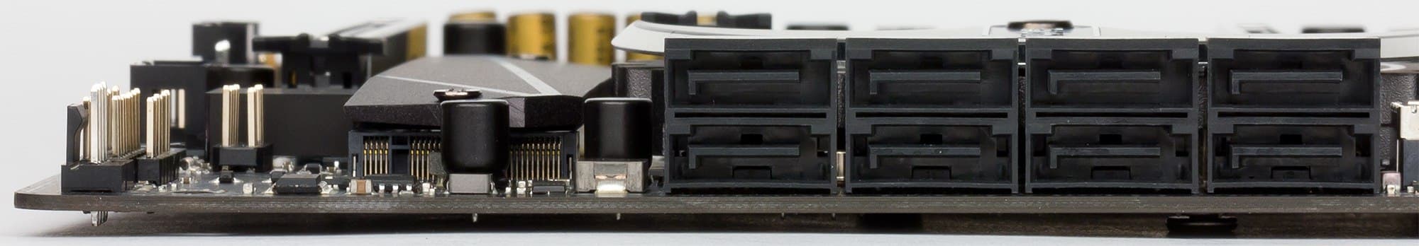 Всего у платы 8 разъемов Serial ATA 6 Гбит/с + 3 слота для накопителей в форм-факторе M.2. (Еще один слот M.2, спрятанный под кожухом блока разъемов задней панели, занят контроллером беспроводных сетей Wi-Fi/BT.)