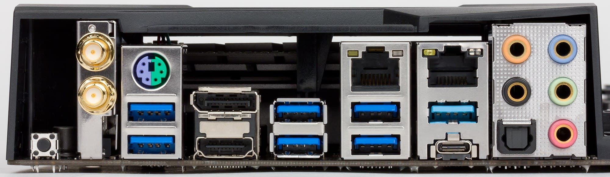 | Разъемы на задней панели | 1 × USB 3.1 (Type-C) 3 × USB 3.1 (Type-A) 4 × USB 3.0 2 × RJ-45 1 × PS/2 5 аудиоразъемов типа миниджек 1 × S/PDIF (оптический, выход) 1 × HDMI 1.4 1 × DisplayPort 1.2 2 антенных разъема 1 кнопка сброса CMOS |