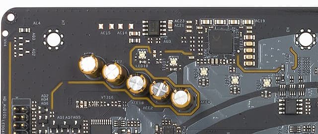 Аудиотракт вынесен на угловую часть платы, не пересекается с другими элементами. По заявлению производителя, левый и правый каналы усилителя разведены по разным слоям печатной платы. Аудиотракт комплектуется аудиоконденсаторами Nichicon Fine Gold. В целом, это стандартная по нынешним меркам аудиоподсистема, способная удовлетворить запросы большинства пользователей, не ожидающих от звука на материнской плате чудес. Разумеется, эстетам надо обратиться ко все еще живой компании Creative Labs за ее решениями в области «улучшенного звука» либо и вовсе смотреть в сторону отдельных аудиофильских продуктов.