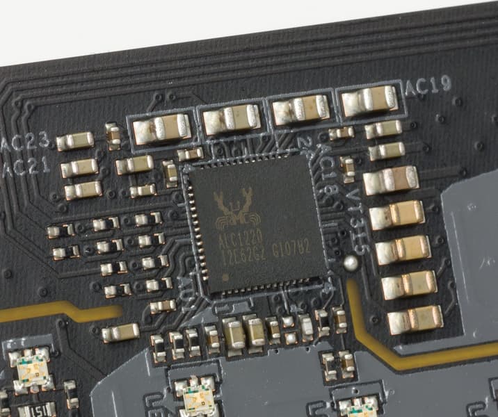 Здесь, как обычно, всем заправляет вездесущий и всемогущий аудиокодек Realtek ALC1220. Он обеспечивает вывод звука по схемам до 7.1, тут ничего нового. Сопутствует ему усилитель для наушников NE5532 компании Texas Instruments. Заявлена поддержка наушников с импедансом до 600 Ом.