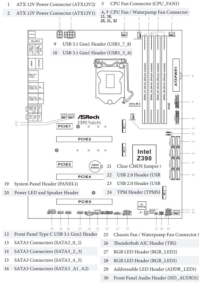 | USB-порты | 5 × USB 3.1 Gen2: 3 × Type-A и 1 × Type-C на задней панели + 1 внутренний порт Type-C (Z390) 4 × USB 3.1 Gen1: 4 порта на задней панели (Z390) 4 × USB 3.1 Gen1: 2 внутренних разъема, каждый на 2 порта (ASMedia ASM1074) 3 × USB 2.0: 2 внутренних разъема, один на 1, второй на 2 порта (Z390) |