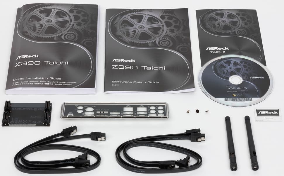 Комплект также обычный для материнских плат среднего уровня, включающий многоязычное руководство пользователя и диск. Не очень понятно, кому сейчас нужны эти книжки, когда все можно скачать из интернета — ну, разве что новый компьютер будет собираться с нуля в сферическом вакууме. Диски вообще абсурдны, потому что CD/DVD-приводов в современных компьютерах давно нет, а ПО успеет 2-3 раза обновиться, пока плата с диском дойдет до покупателя: так что все равно придется первым делом идти на сайт производителя и скачивать все драйверы и фирменные утилиты. Впрочем, Windows 10 прекрасно определила все устройства этой платы, драйвера искать не понадобилось. Также в комплекте идут традиционные SATA-кабели, «заглушка» на заднюю панель с разъемами, три винтика для крепления M.2-накопителей, антенны для беспроводного сетевого адаптера и мост Nvidia SLI (старого образца, для видеокарт GeForce RTX 2xxx он уже не подойдет).
