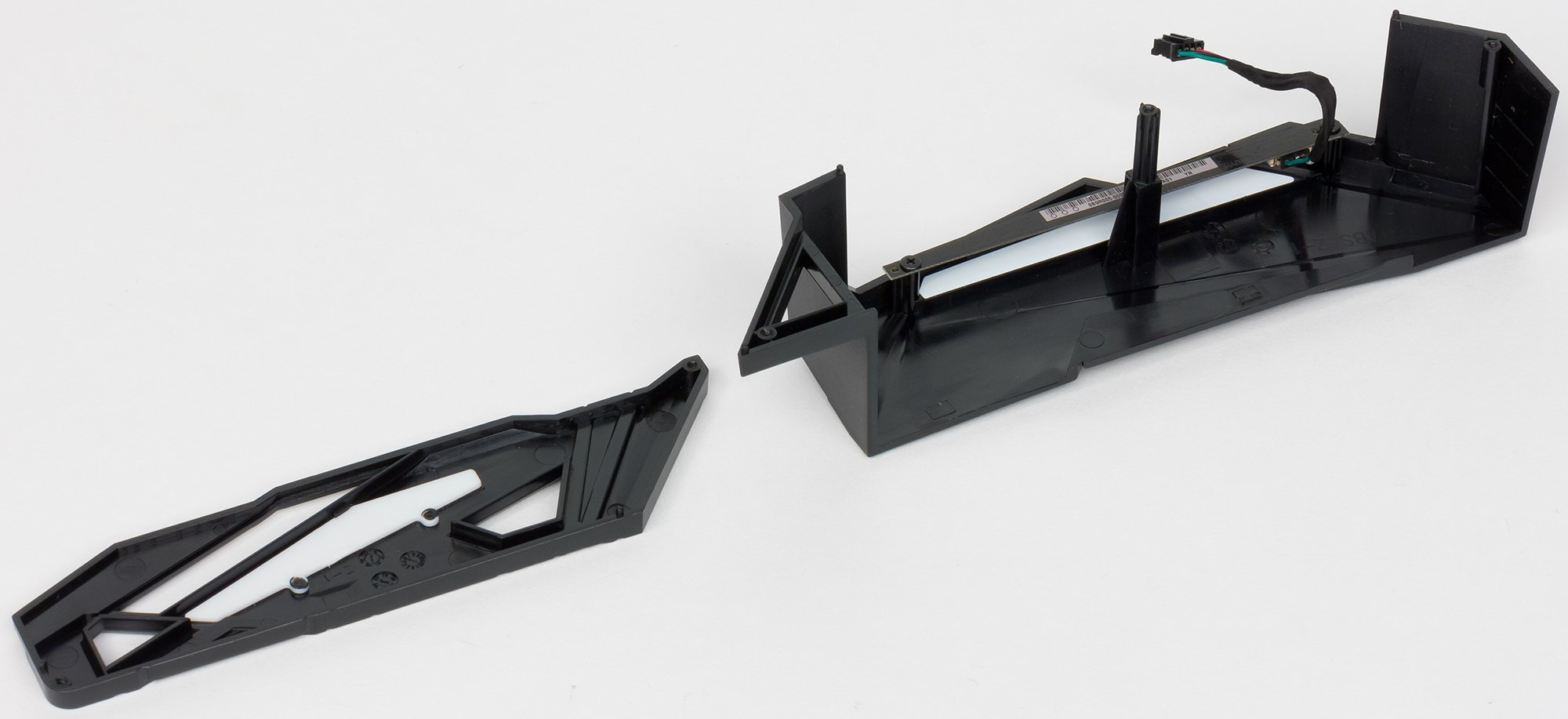Над аудиоподсистемой и над блоком разъемов задней панели установлены пластиковые кожухи соответствующего дизайна (и с подсветкой), радиаторов там нет.