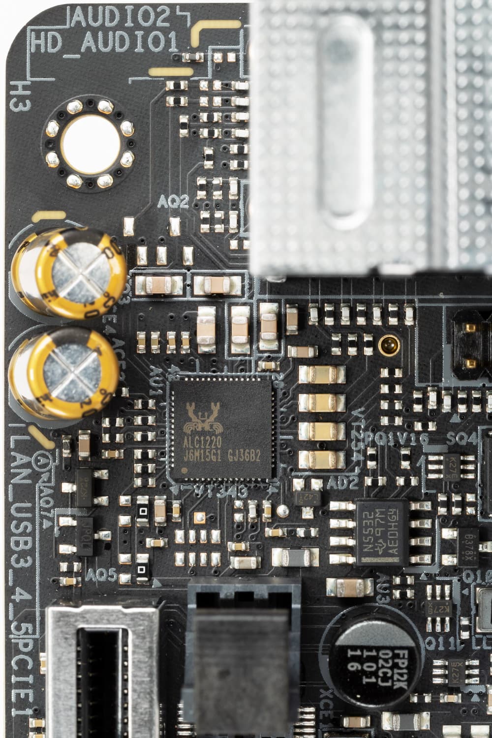 Аудиотракт вынесен на угловую часть платы, не пересекается с другими элементами. Разумеется, левый и правый каналы разведены по разным слоям печатной платы. Все аудиоразъемы на задней панели имеют позолоченное покрытие и привычную цветовую окраску.