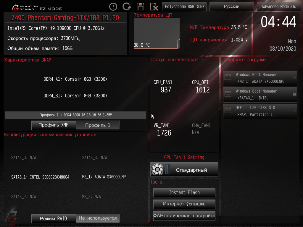 Всего у платы 4 разъема Serial ATA 6 Гбит/с + 2 слота для накопителей в форм-факторе M.2. (Еще один слот M.2, спрятанный под кожухом блока разъемов задней панели, занят контроллером беспроводных сетей Wi-Fi/Bluetooth.). 4 порта SATA реализованы через чипсет Z490 и поддерживают создание RAID.