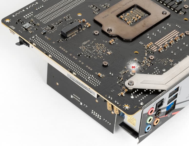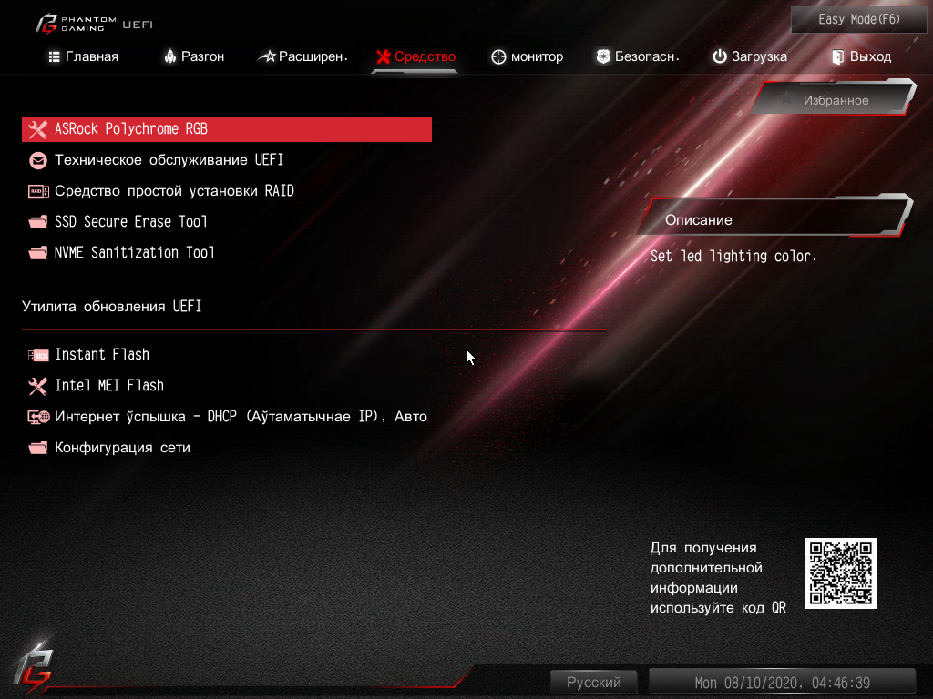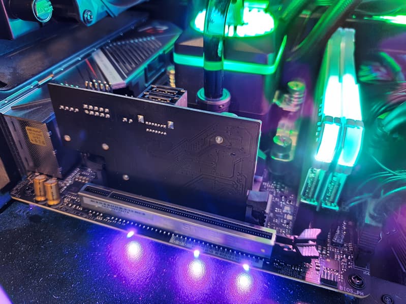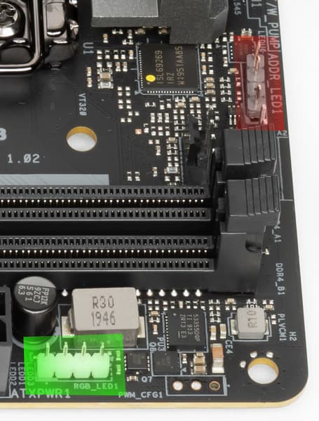 Топовые платы ASRock обычно имеют довольно красивую подсветку: светодиоды могут образовывать яркие эффекты на кожухе, покрывающем задний блок с разъемами, плюс всегда подсвечен радиатор чипсета. Но в данном случае из-за малых размеров платы создатели ограничились использованием нескольких светодиодов на обороте PCB около кромки, где слот PCIe. Плюс мы помним про 2 разъема для подключения внешней подсветки, и всем этим можно управлять через программу ASRock RGB Polychrome Sync.
