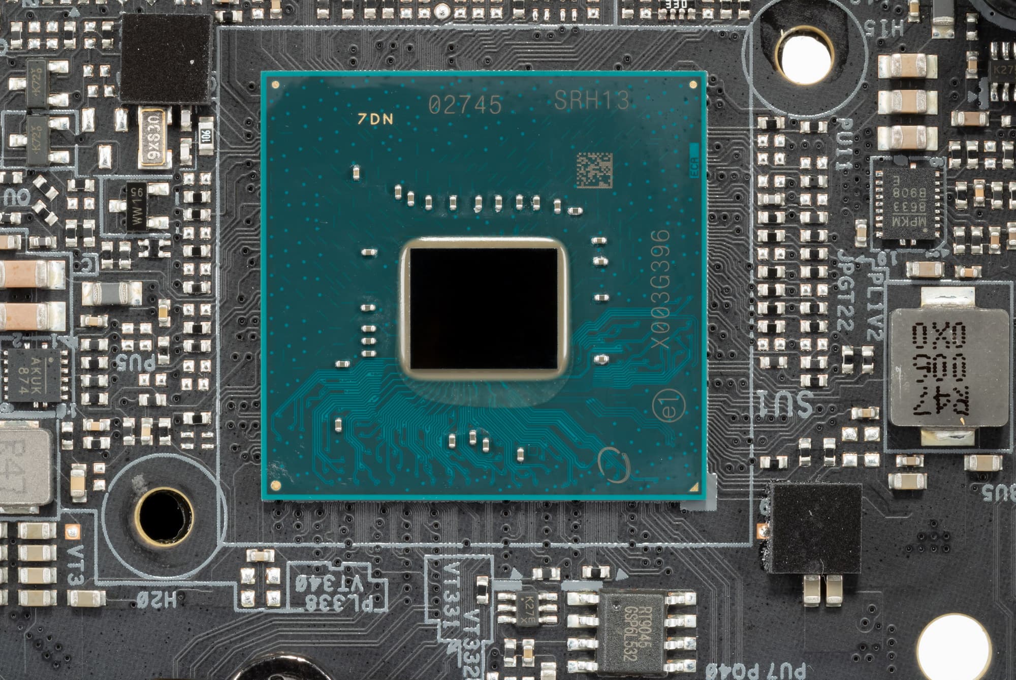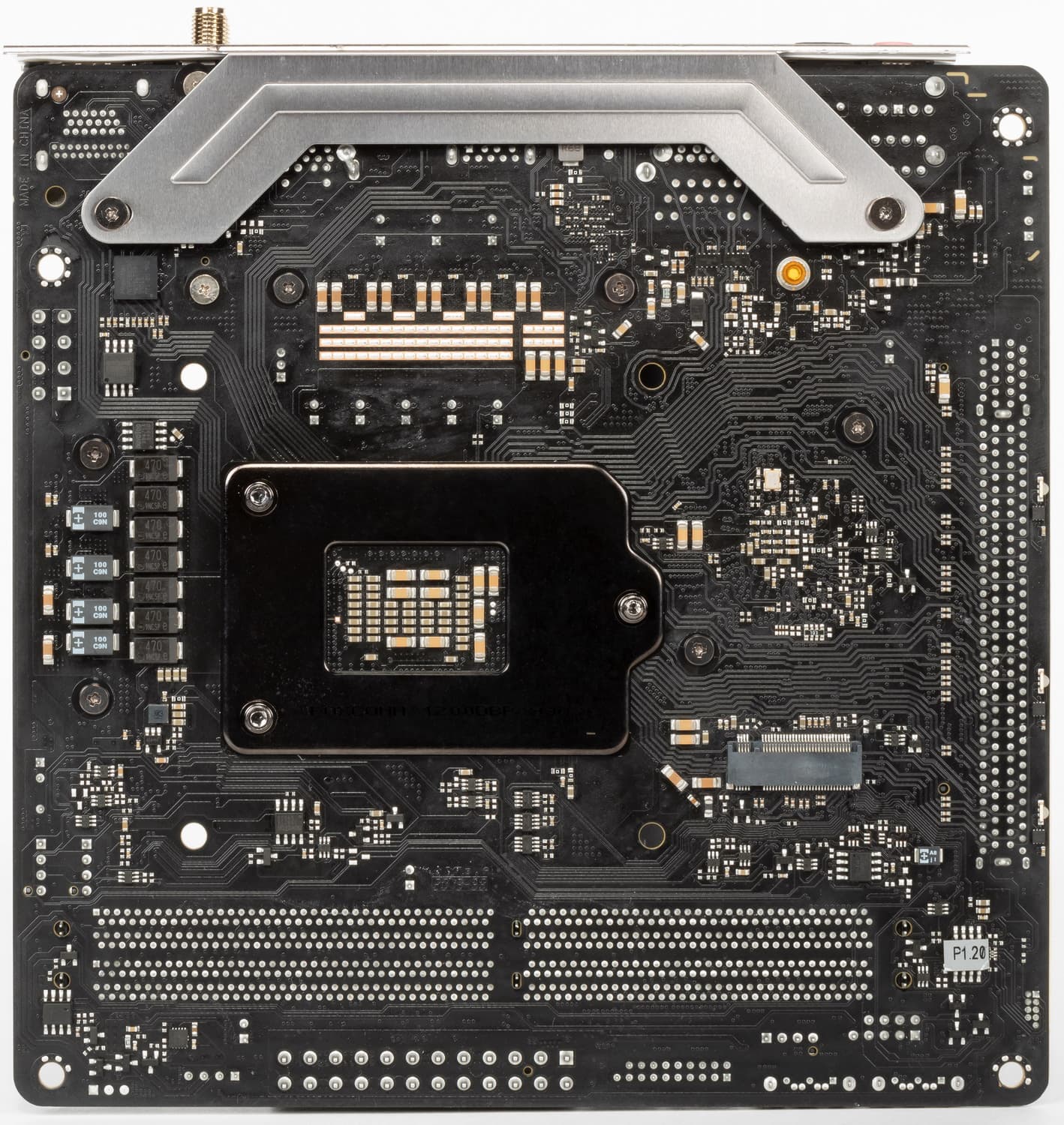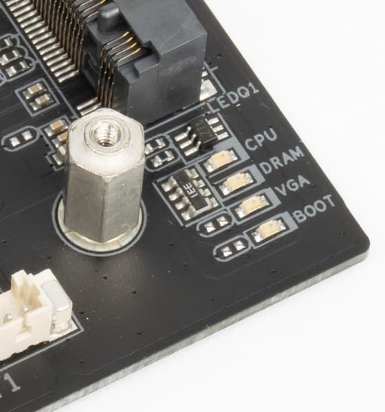 Учитывая малую площадь PCB в целом, оборотная сторона не пустует. Мы видим не только слот M.2, но и ряд контроллеров. Обработан текстолит хорошо: во всех точках пайки острые концы срезаны. Печатная плата имеет 8 слоев. Часть периферии вынесена на карту расширения с особым проприетарным слотом.