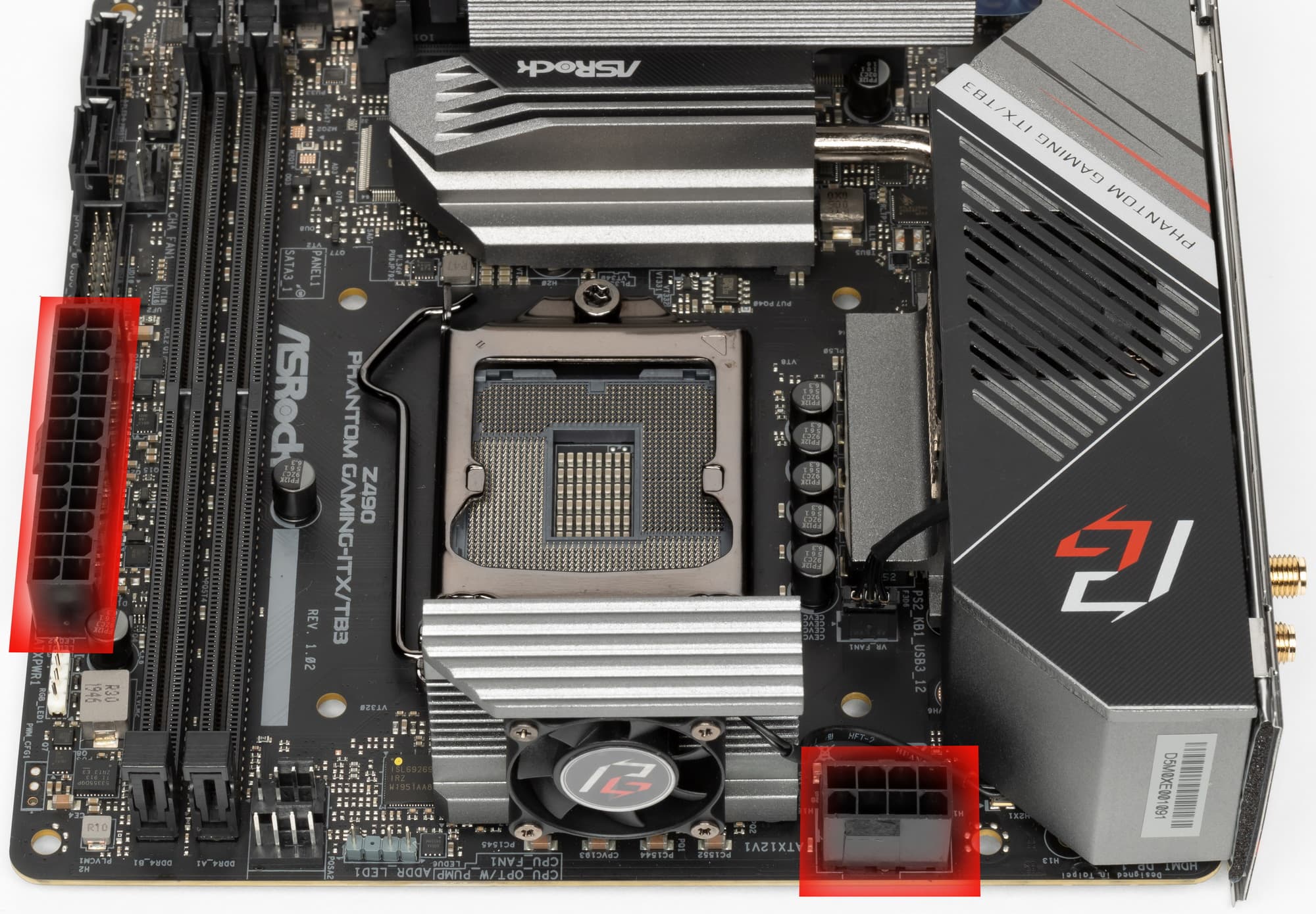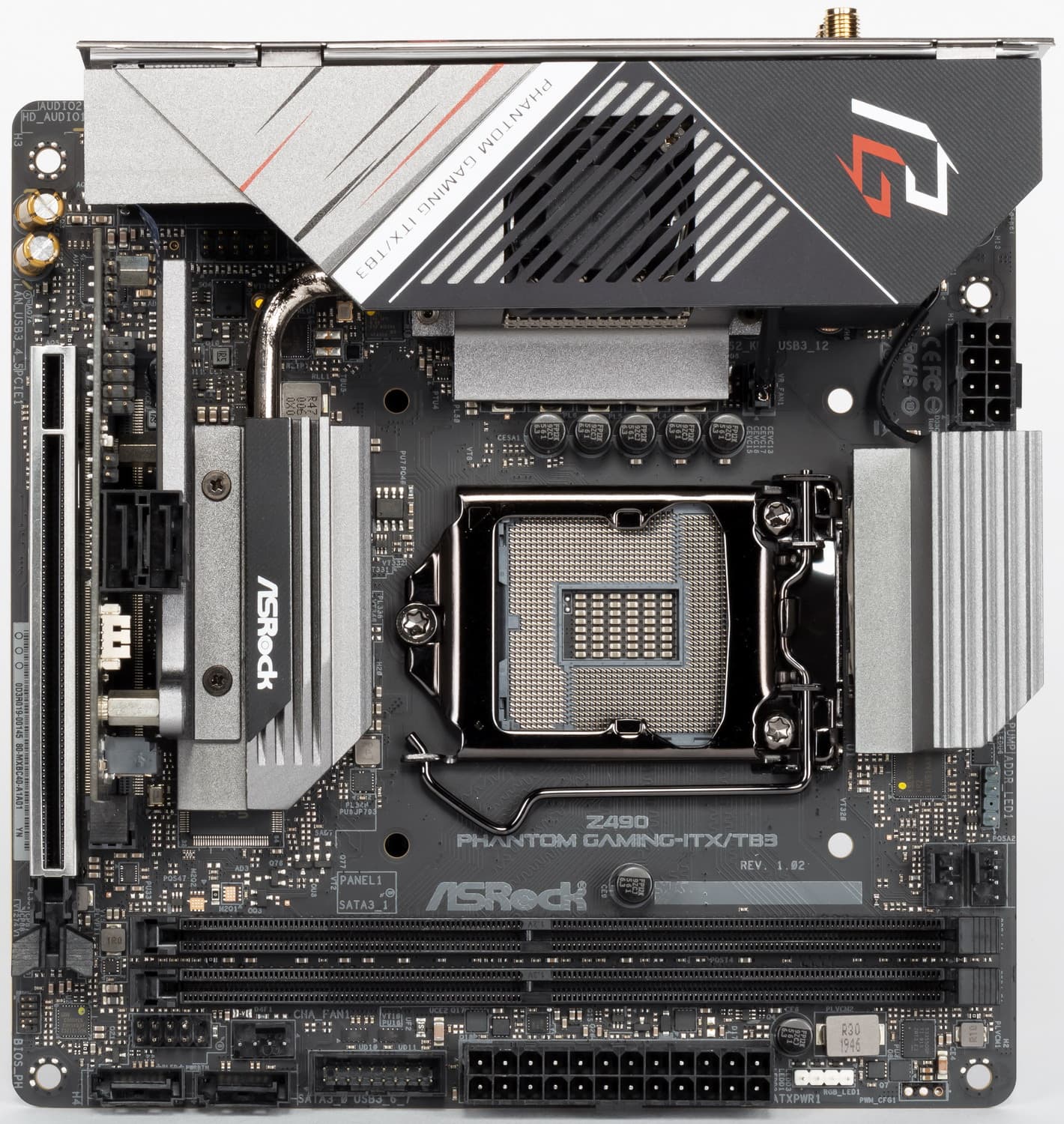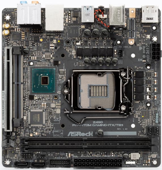 Форм-фактор Mini-ITX был разработан компанией VIA Technologies в 2001 году, но изначально был формат ITX, который не прижился, а популярной стала его мини-версия Mini-ITX с размерами 170х170 мм. В те годы было огромное разнообразие процессоров бюджетного сегмента, которым подчас даже не требовалась активная СО, было достаточно просто радиатора, поэтому в начале матплаты Mini-ITX выпускались уже со впаянными процессорами (без сокетов). По мере развития и надобности смены процессоров без замены самой материнки тот же формат заимел сокеты. Имеется и еще более миниатюрный вариант — Nano-ITX с размерами 120х120 мм. Однако, очевидно, что это уже явно не для топовых чипсетов и уж тем более не для быстрых процессоров, требующих весьма приличную систему питания. Материнская плата ASRock Z490 Phantom Gaming-ITX/TB3 имеет размеры 170×170 мм, выполнена в форм-факторе Mini-ITX, и на ней имеются 4 монтажных отверстия для установки в корпус.