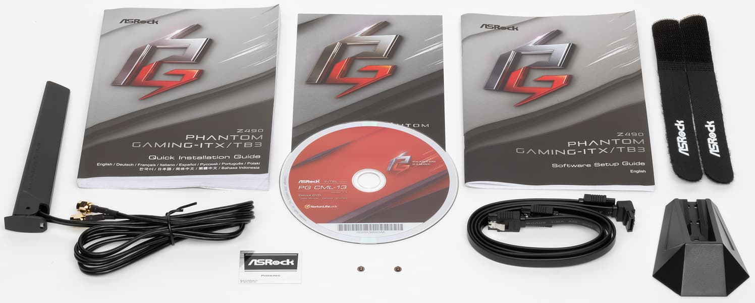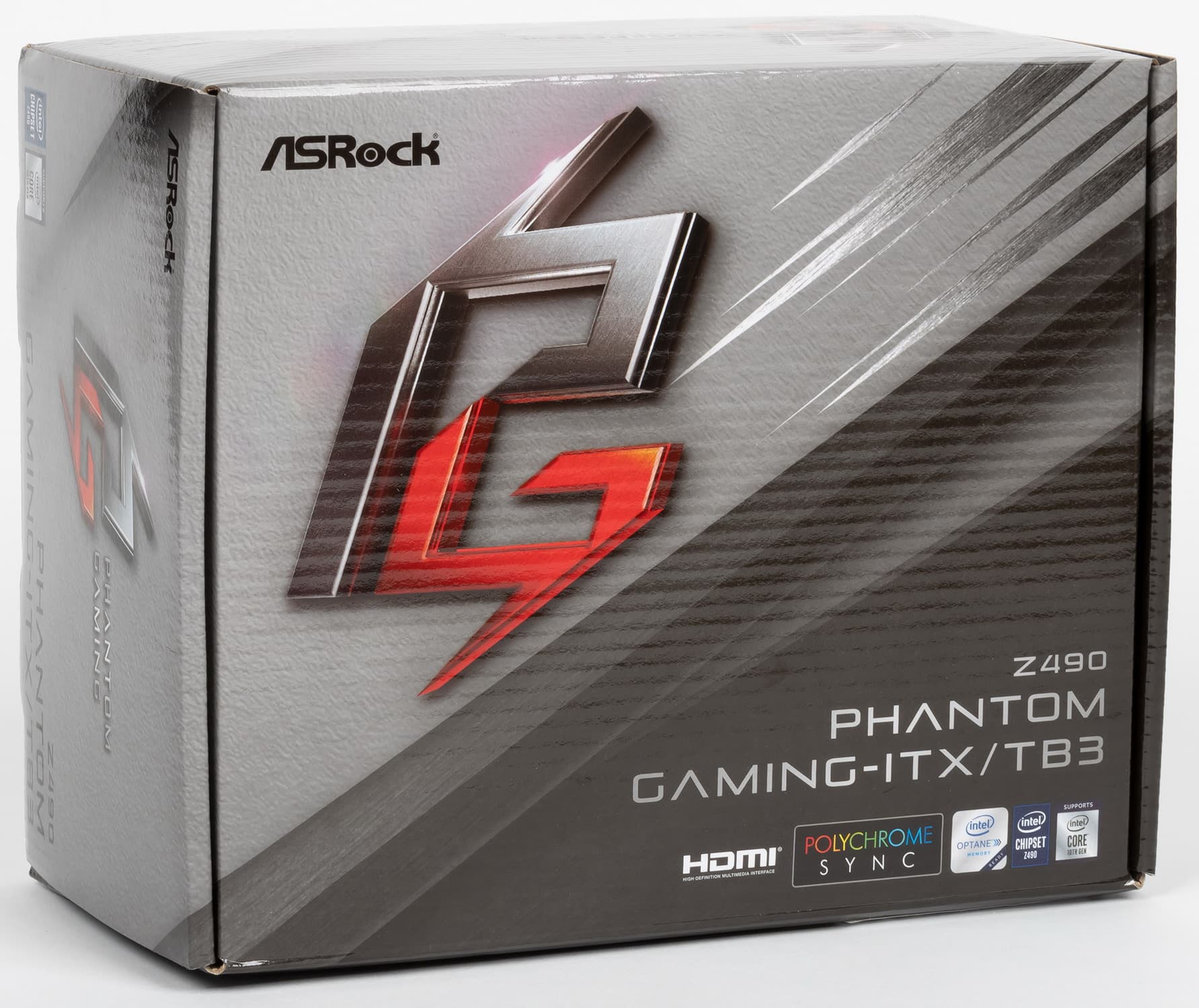 ASRock Z490 Phantom Gaming-ITX/TB3 поставляется в маленькой, но толстой коробке со стильным дизайном серии Phantom Gaming.