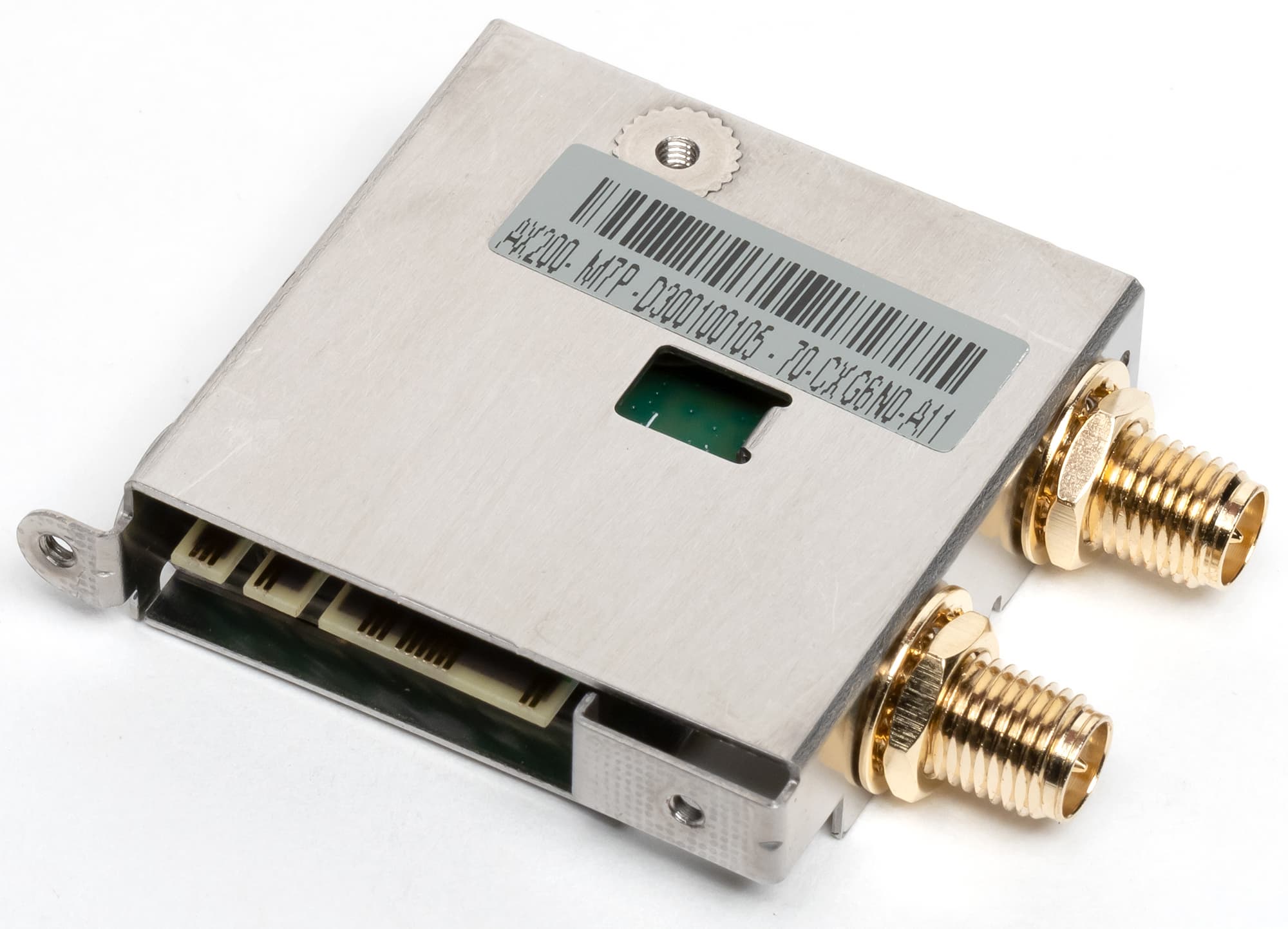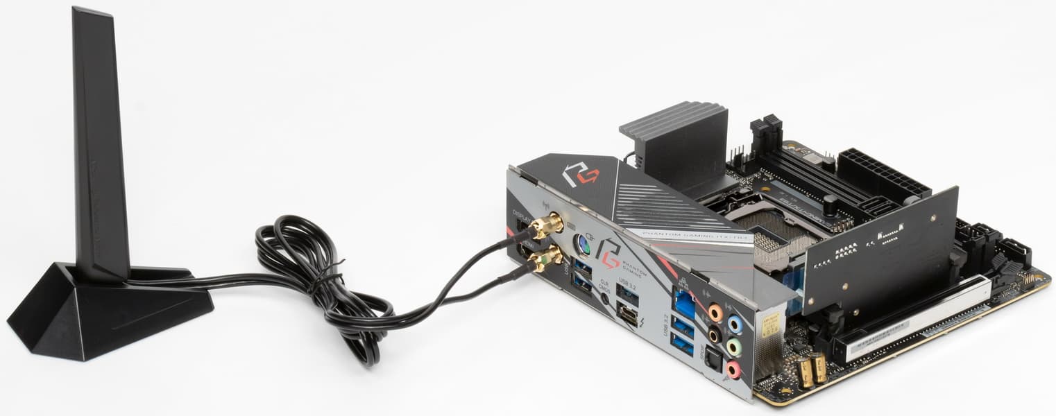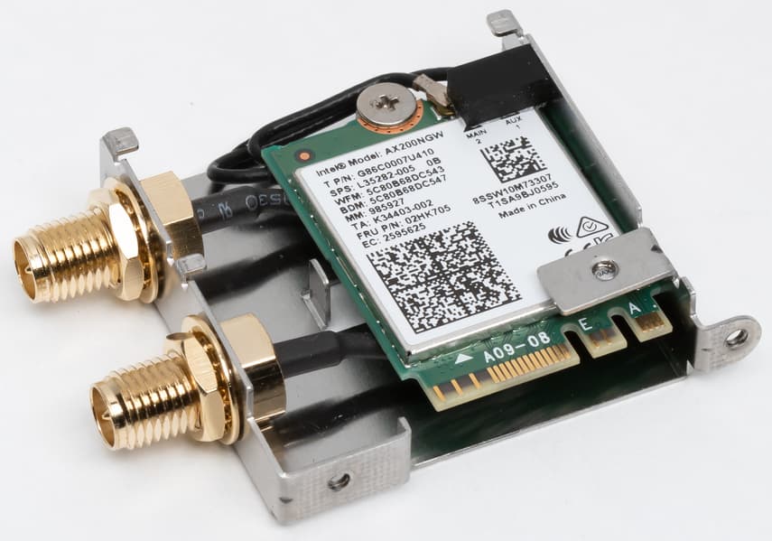 Имеется и комплексный беспроводной адаптер на контроллере Intel AX200NGW, через который реализованы Wi-Fi (802.11a/b/g/n/ac/ax) и Bluetooth 5.0. Он установлен в слот M.2 (E-key), и его разъемы для привинчивания выносных антенн выведены на заднюю панель.