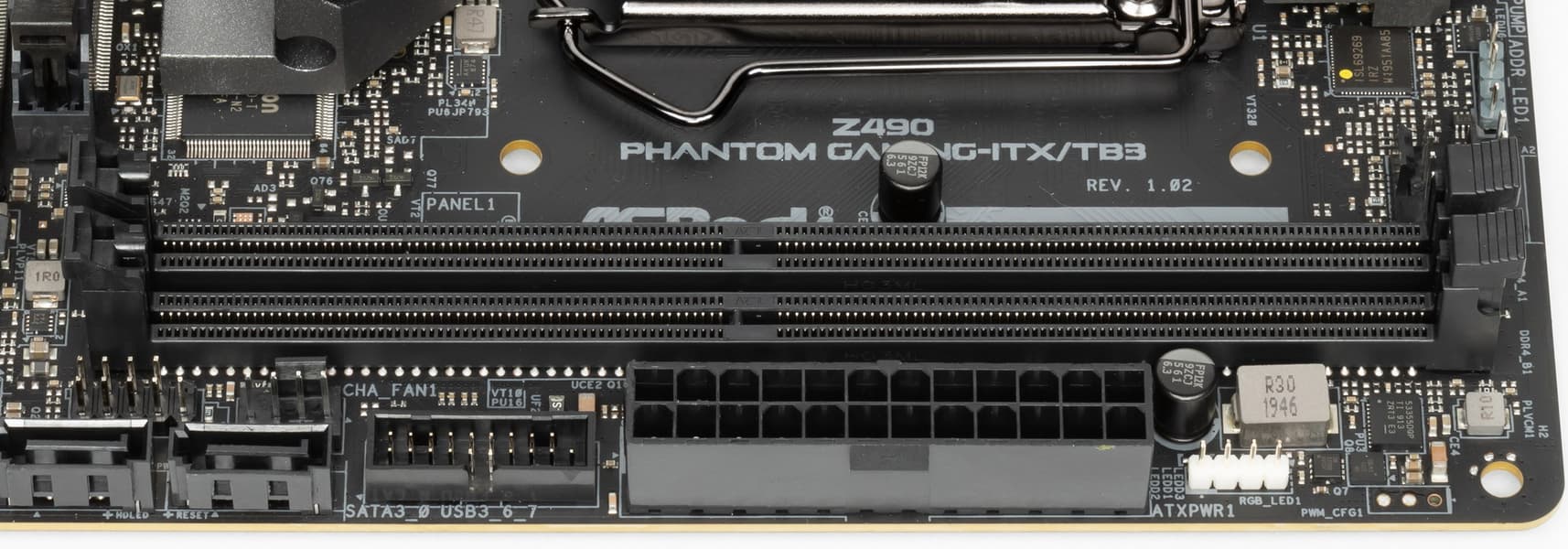 Для установки модулей памяти на плате Phantom Gaming имеется два DIMM-слота. Плата поддерживает небуферизованную память DDR4 (non-EСС), а максимальный объем памяти составляет 64 ГБ (при использовании UDIMM последнего поколения по 32 ГБ). Разумеется, поддерживаются профили XMP.