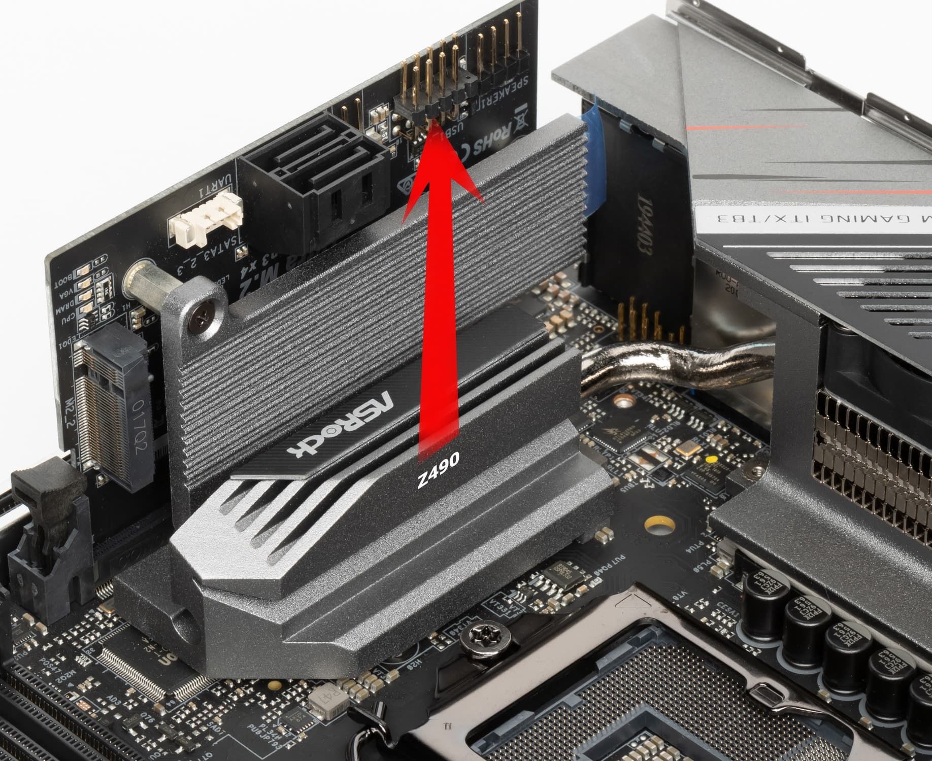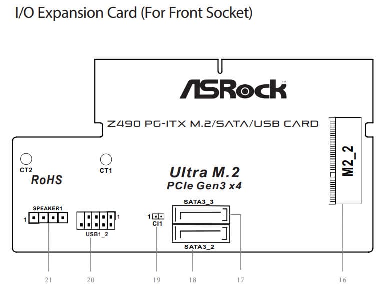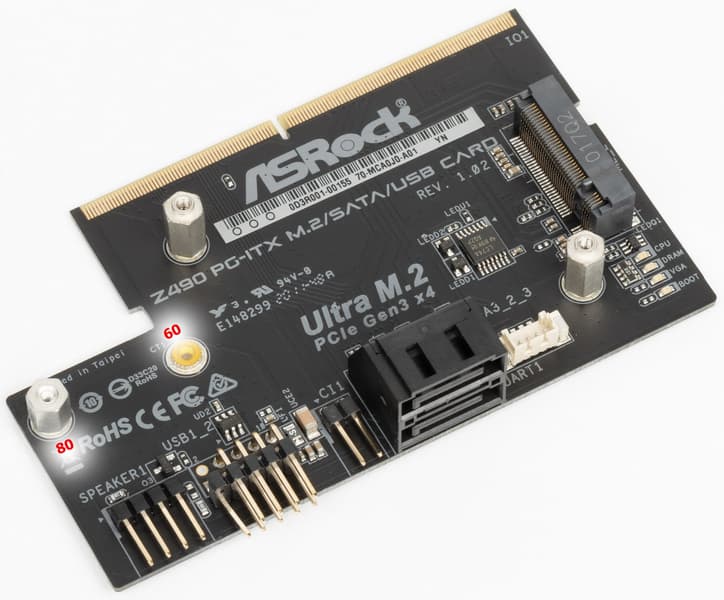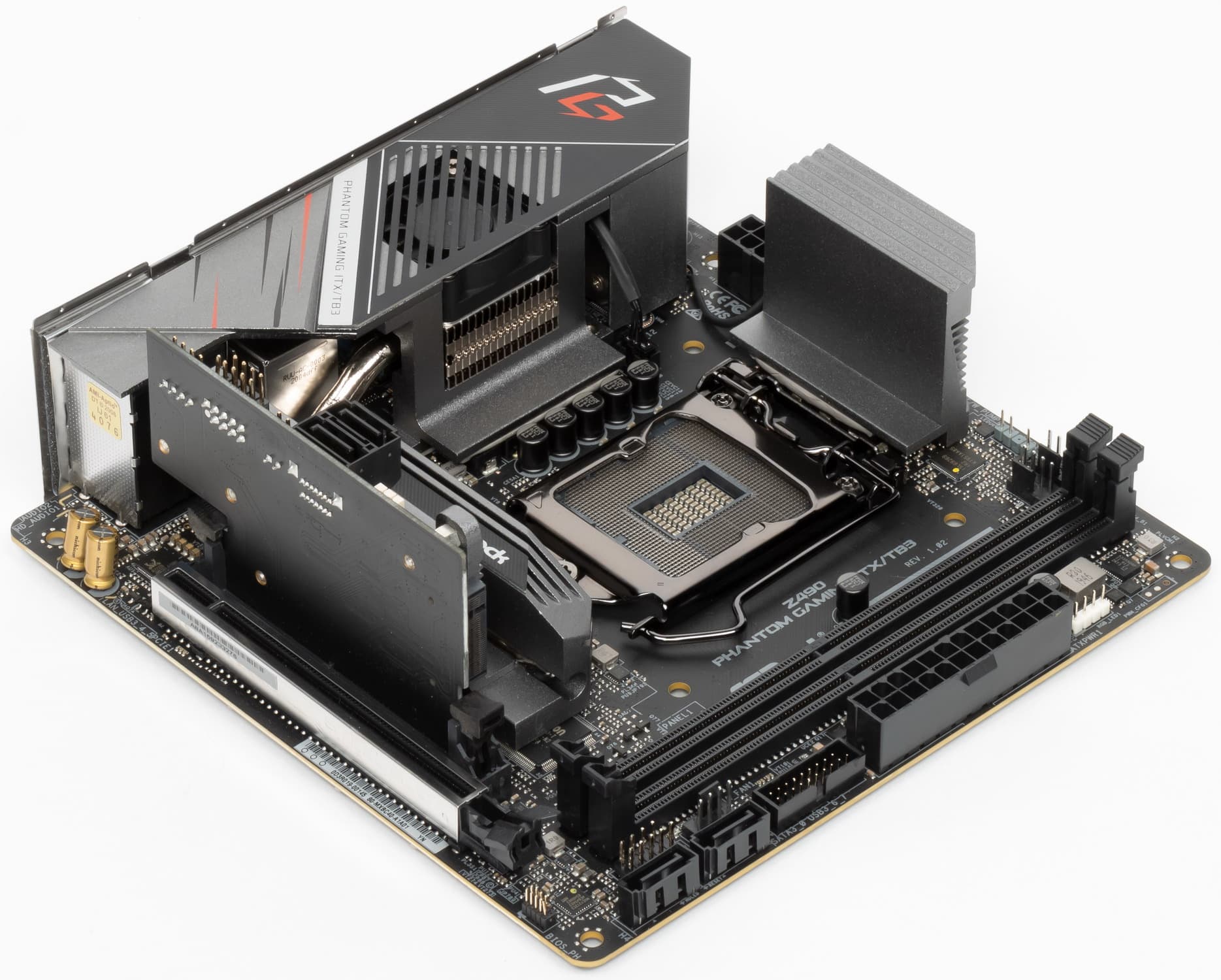 Для того, чтобы вся периферия смогла уместиться на столь компактной печатной плате разработчики придумали свой особый слот IO1, и собственную карту расширения Z490 PG-ITX.