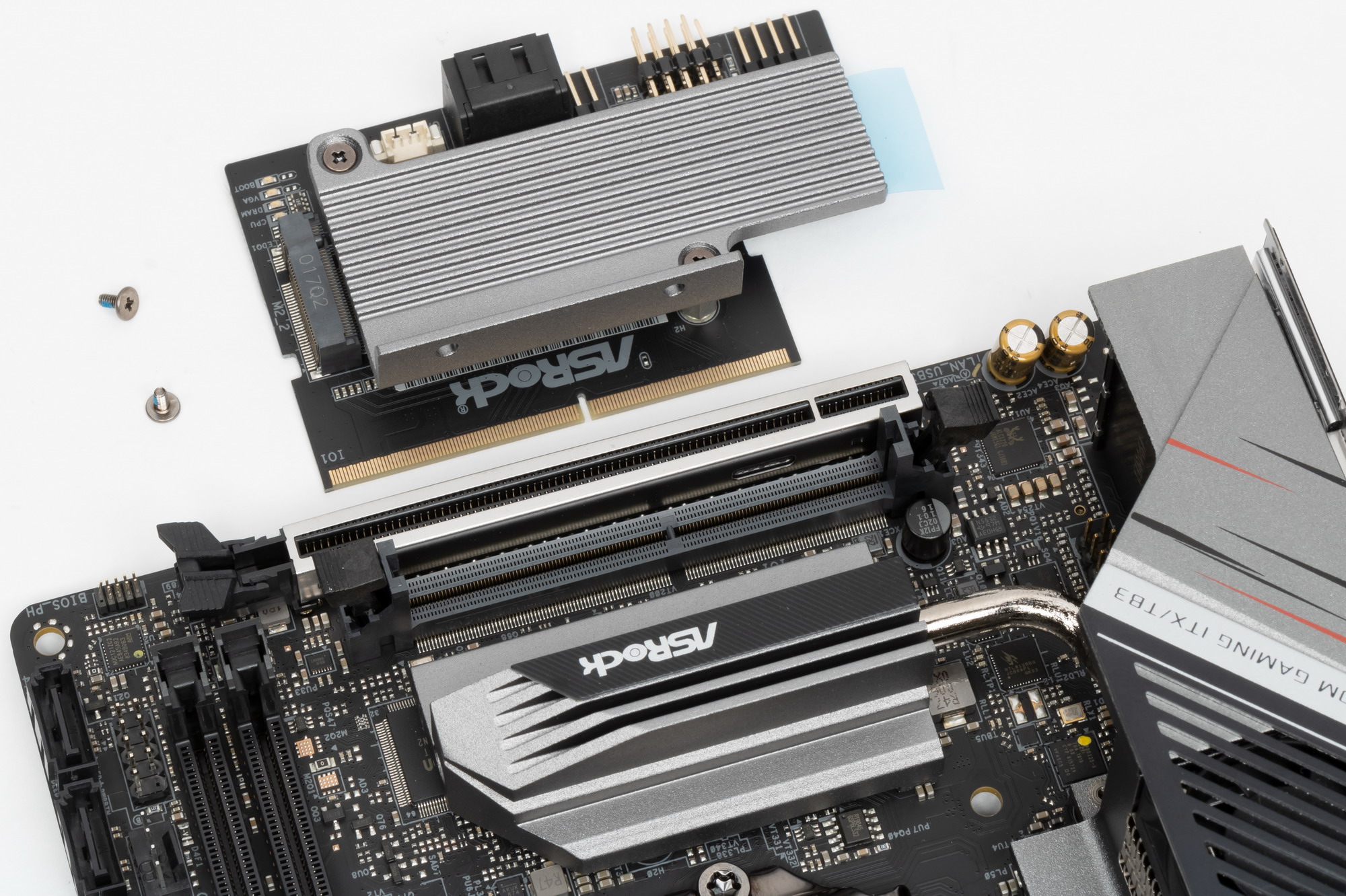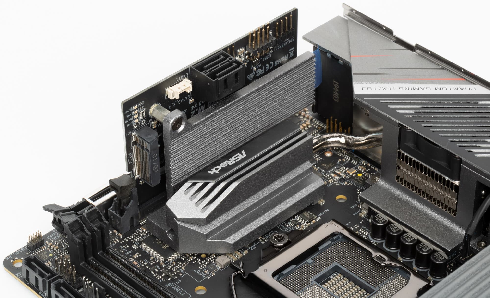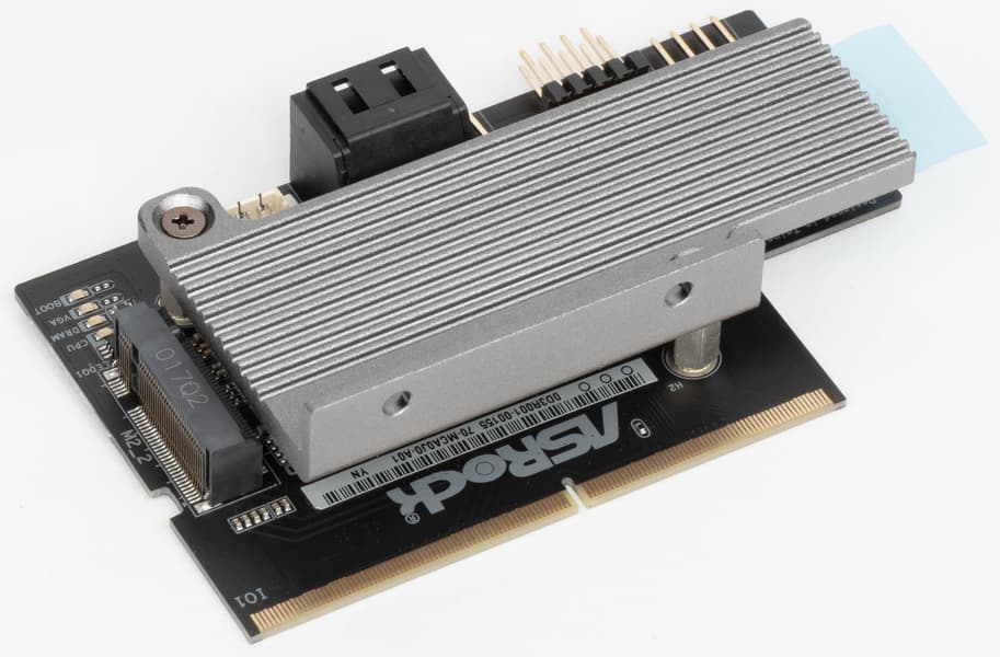M.2_1 слот на самой матплате не оснащен радиатором (понятно, что раз он расположен на обороте PCB, то просто нет места для радиатора). M.2_2 на карте расширения имеет радиатор.
