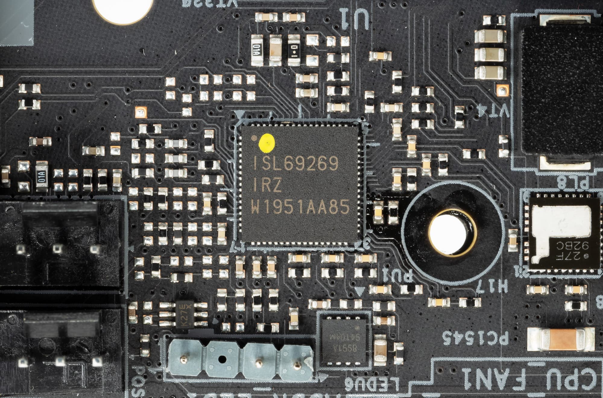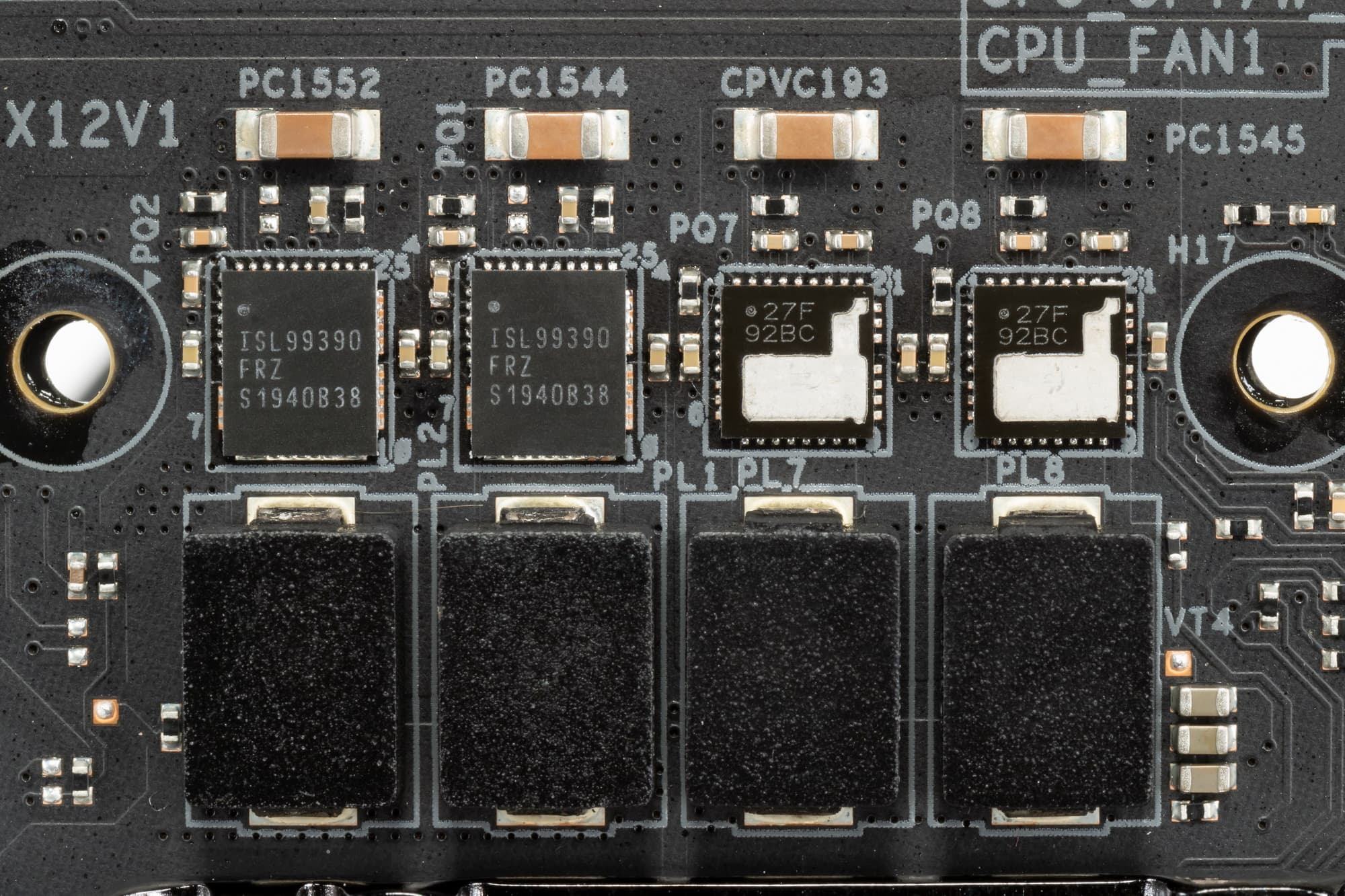 Каждый канал фазы имеет суперферритовую катушку, а блок Vcore также имеет MOSFET ISL99390 от того же Intersil/Renesas, рассчитанный на токи до 90 А.