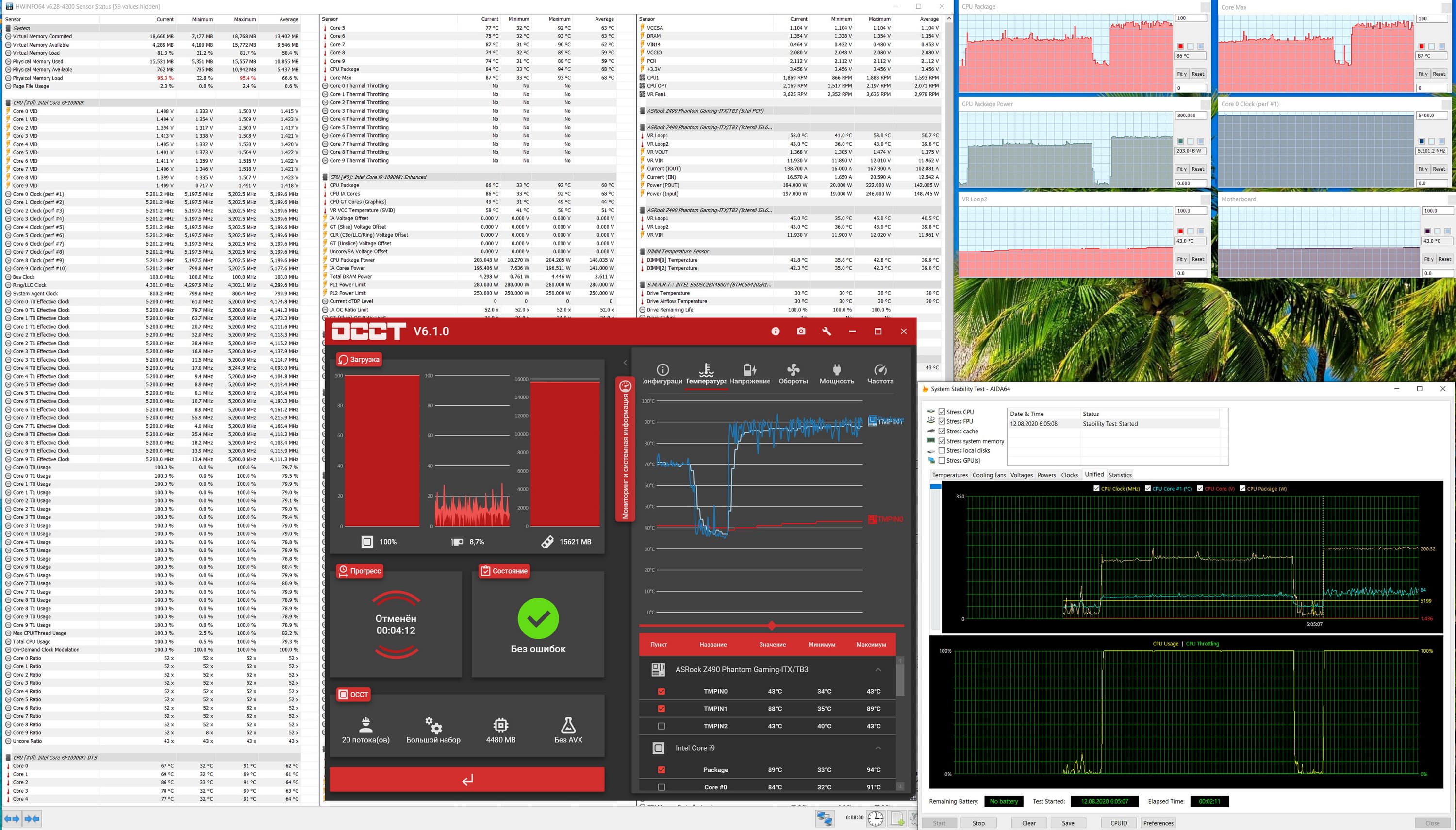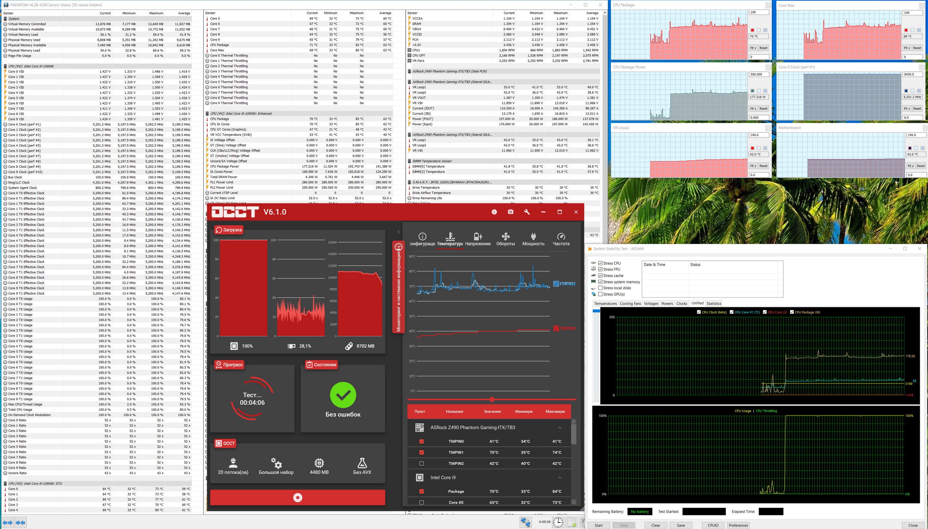 Нагрев чуть вырос, потребление процессора уже превысило 200 Вт, но все еще далеко от лимитов PL. Периферия в норме. Вентиляторы VRM слышны. До троттлинга еще далеко, но уже понятно, что запускать систему на 5,3 ГГц бесполезно. И то, считаю, что на такой «лапотульке» получить 5,2 ГГц — это супер просто!