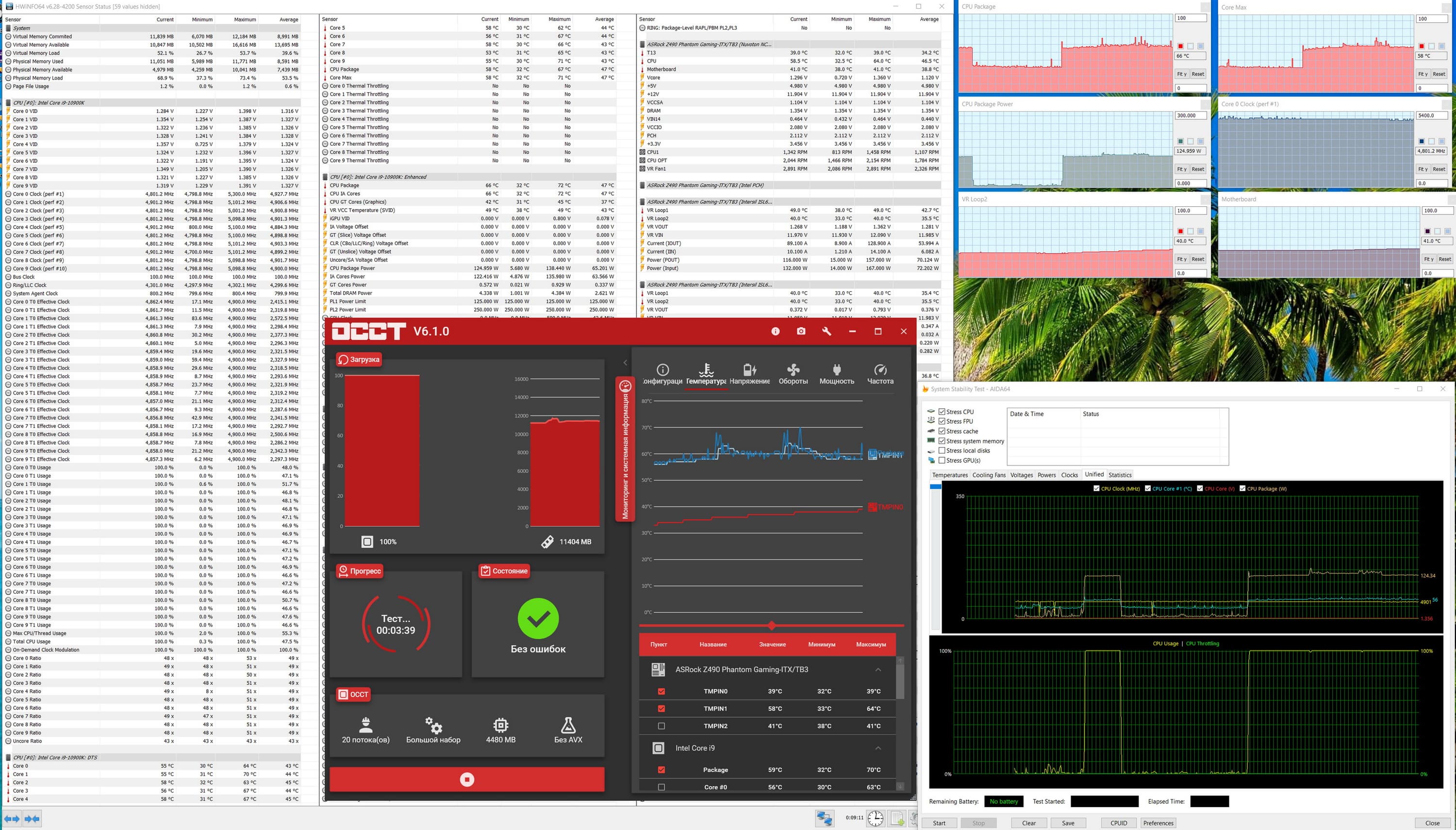 Как я уже неоднократно писал, если не включить полностью MCE, то работа платы будет подчинена требованиям Intel PL и потому мы видим 4,9 ГГц по ядрам. При этом все параметры работы держались в норме, все вышеуказанные тесты прошли без проблем. Нагрев блока VRM и чипсета Z490 не превышал 50°C, необычных явлений не замечено, вентиляторы VRM хоть и выдавали более 2000 оборотов в минуту, но шума от них не было заметно (впрочем когда ЖСО «орет» из-за 3500 оборотов на вентиляторах, то как-то сложно заметить нежно-поэтическое звучание всякой мелочи). Максимальное потребление процессором достигло величины в 139 Вт.