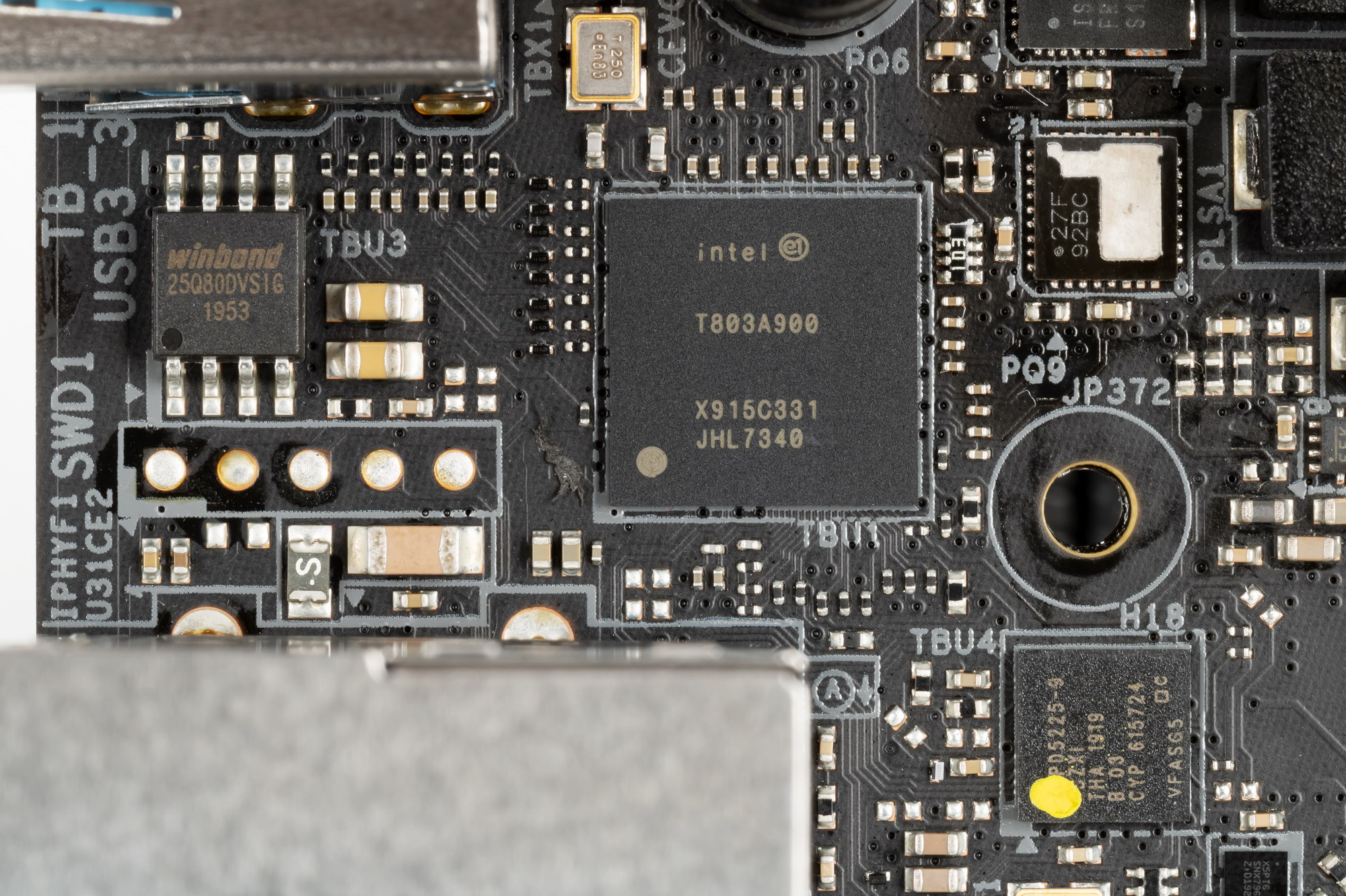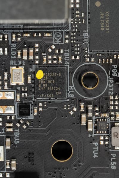 Он обслуживает единственное гнездо USB Type-C на задней панели платы. В случае использования протокола TB3 производительность может достигать 40 Гбит/с, но тот же порт Type-C может работать и как USB 3.2 Gen2 с производительностью до 10 Гбит/с, для переключения протоколов имеется контроллер CYPD5225 (Cypress/Infineon).