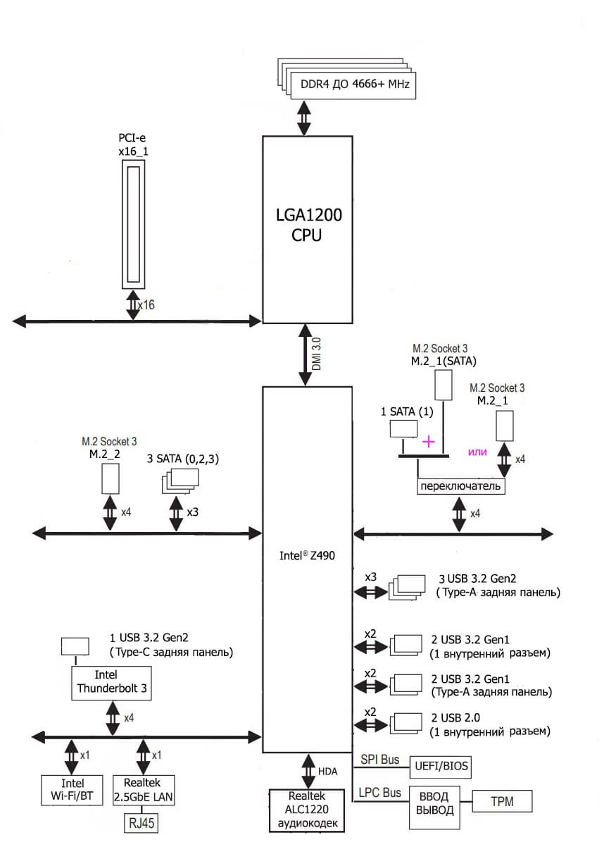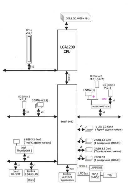 Процессоры Intel Core 10-го поколения (совместимые с сокетом LGA1200 и поддерживаемые Z490) имеют 16 линий ввода-вывода (включая PCIe 3.0), не имеют USB и SATA портов. При этом взаимодействие с Z490 идет по особому каналу Digital Media Interface 3.0 (DMI 3.0), и линии PCIe на это не расходуются. Все PCIe линии процессора идут на слоты расширения PCIe. Serial Peripheral Interface (SPI) используется для взаимодействия с системой UEFI/BIOS, а шина Low Pin Count (LPC) — для связи с устройствами ввода/вывода, не требующими высокой пропускной способности (контроллерами вентиляторов, TPM, старой периферии).