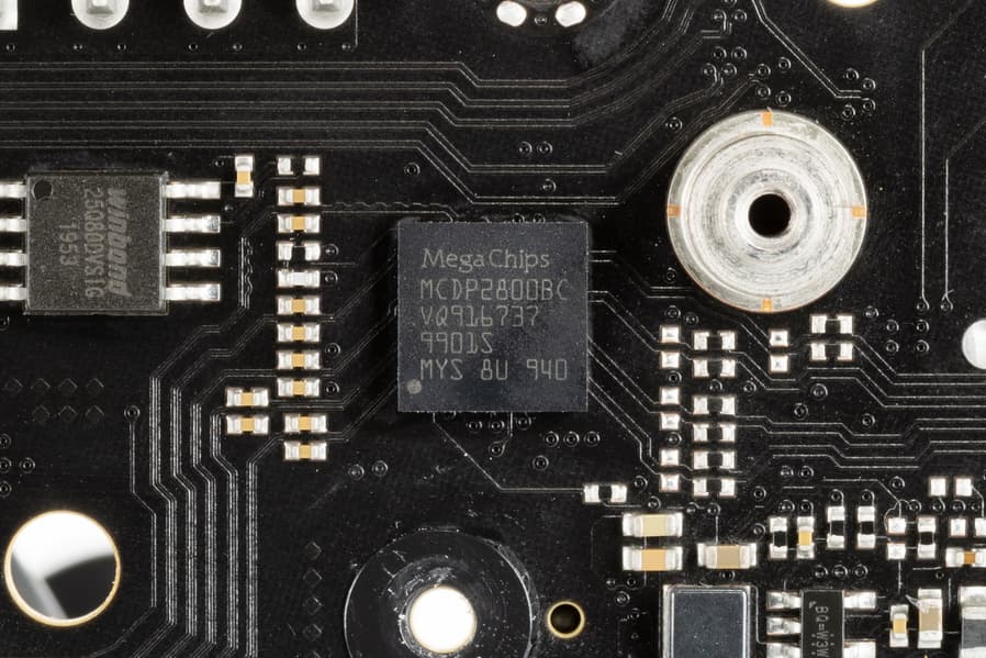 Поскольку большинство процессоров Intel под LGA 1200 имеют интегрированную графику, предусмотрен вывод видеоподсистемы через два гнезда HDMI 2.0 и DP 1.2. При этом вывод на HDMI 2.0 осуществляется путем конвертации сигнала DP, за что отвечает контроллер от Megachips, расположенный на оборотной стороне платы.