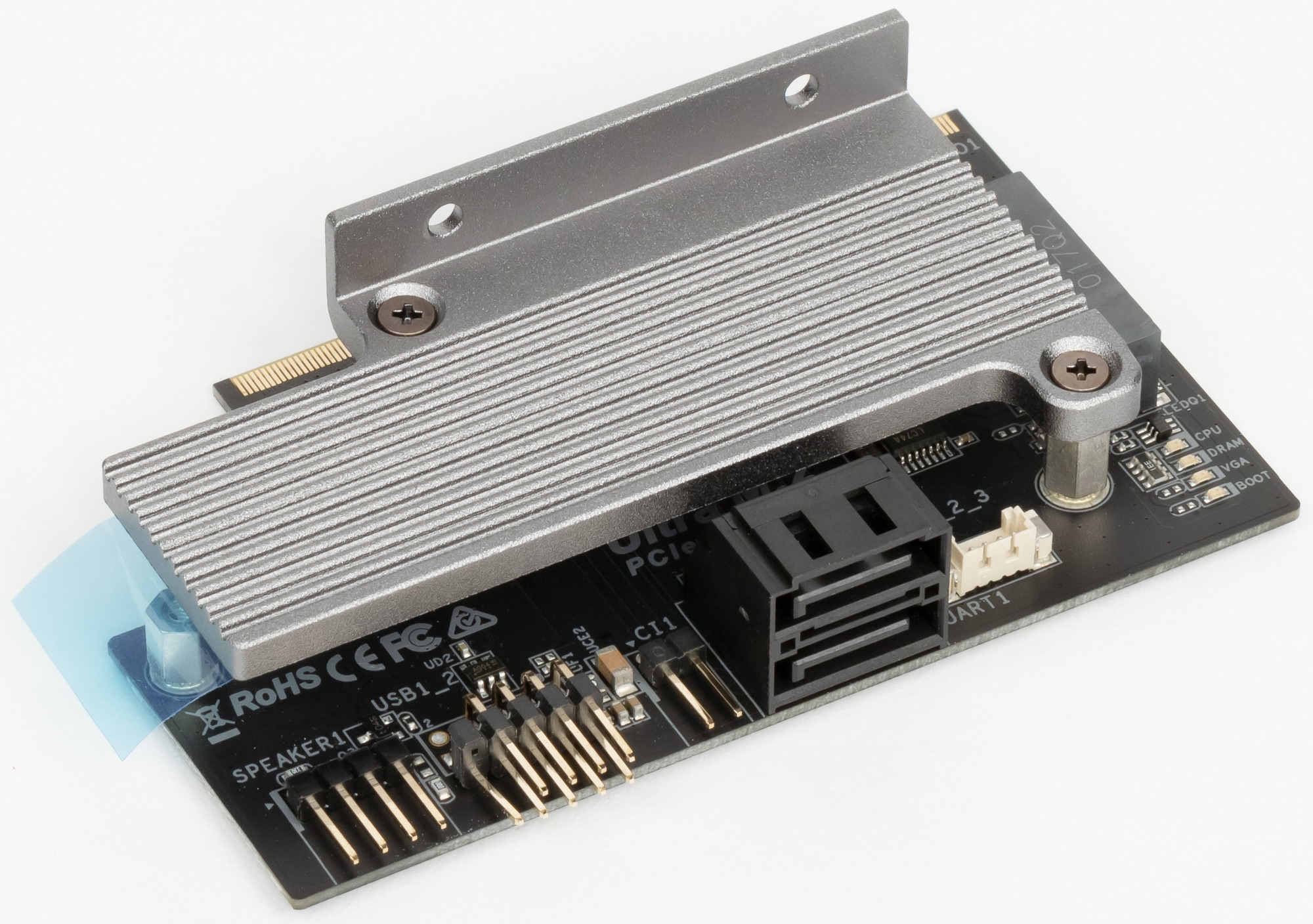 И поэтому два порта SATA размещены на основной PCB, а два остальных — на этой карте.