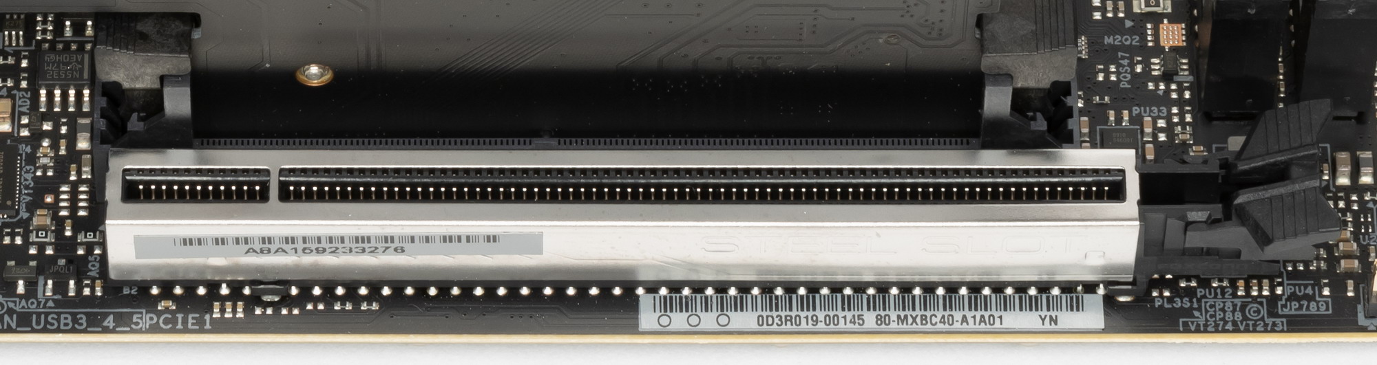 В отличие от слотов для памяти, слот PCIe x16 имеет металлическое армирование из нержавеющей стали, которое увеличивает надежность, а также такая защита предохраняет слот от электромагнитных помех.