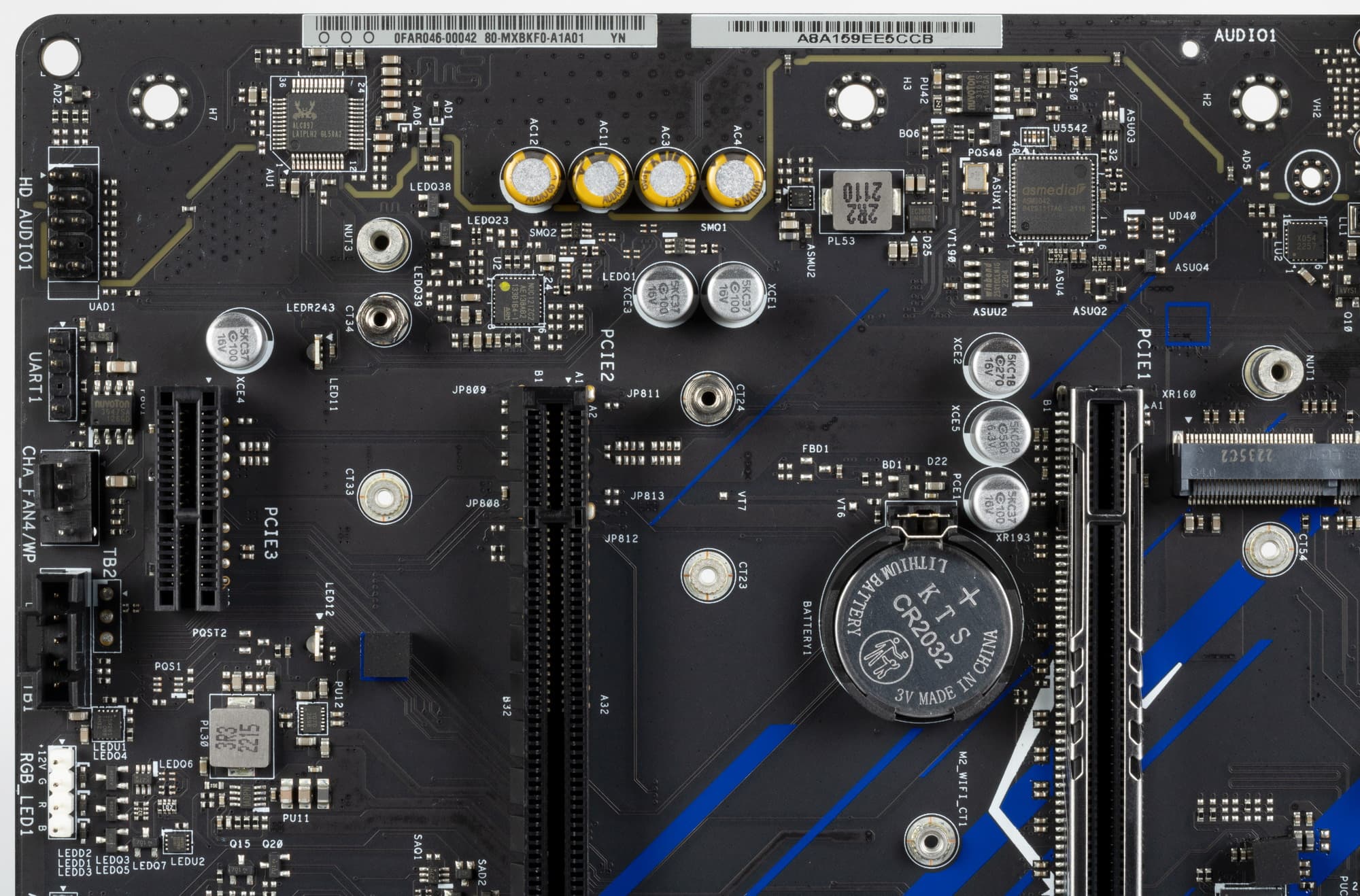 28 линий PCIe оказались занятыми (16 PCIe 4.0 + 4 SATA + 8 PCIe 3.0). Связь с аудиокодеками уровня Realtek RTL408x идет через USB 2.0, а с кодеками уровня RTL1220 и ниже – через HDA (эмуляцию шины PCI), так что в данном случае линия USB 2.0 не расходуется. Но один USB 2.0 расходуется на поддержку слота M.2 (Key E) для беспроводной связи, а также контроллер AMS1074 для своих нужд использует сигнальные линии USB 2.0. Детально об этом ниже в разделе USB-портов.