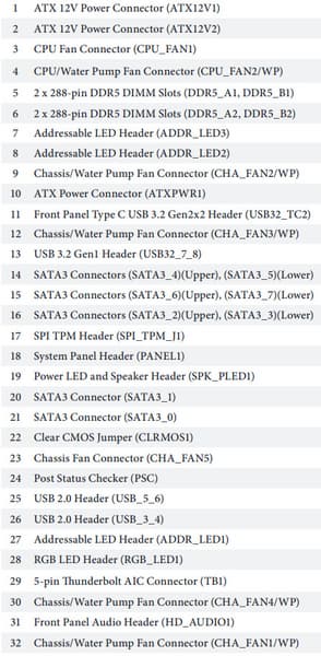 | Прочие внутренние элементы | 24-контактный разъем питания ATX 2 8-контактный разъем питания EPS12V 1 слот M.2 (E-key), под адаптер беспроводных сетей 1 разъем для подключения порта USB 3.2 Gen2x2 Type-C 1 разъем для подключения 2 портов USB 3.2 Gen1 2 разъема для подключения 4 портов USB 2.0 7 разъемов для подключения 4-контактных вентиляторов и помп ЖСО 1 разъем для подключения неадресуемой RGB-ленты 3 разъема для подключения адресуемой ARGB-ленты 1 разъем аудио для передней панели корпуса 1 разъем для устройств безопасности TPM 1 разъем для дискретных карт Thunderbolt 2 разъема для подключения управления с передней панели корпуса 1 разъем сброса CMOS |