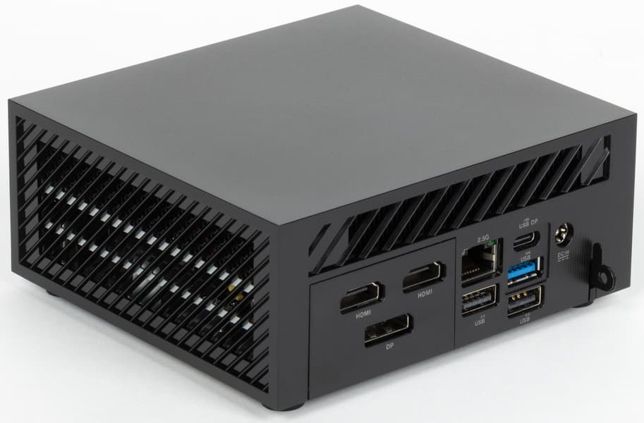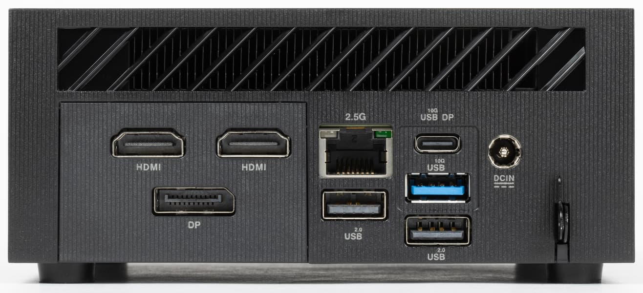 Еще четыре порта USB находятся сзади — и это серьезный шаг вперед по сравнению с PN64, где их было всего два. Но вот до PN64-E1 не дошагнули — там был Thunderbolt, а не просто USB3 Gen2, совмещенный с DisplayPort, да и два дополнительных USB-порта были хотя бы 3.0 (простите, 3.2 Gen1), а не 2.0. Так что компромисс. Но, компромисс, на наш взгляд, разумный: двух портов USB объективно маловато для подключения всей возможной периферии, задействование передних портов не всегда хорошо эстетически, а для разных мышей и клавиатур USB 2.0 как раз достаточно. В общем, не придется задумываться о хабах, что покупателю PN64 могло потребоваться. Впрочем, хабы — штука удобная, особенно если это монитор со встроенным хабом и входом USB-C — но при подключении к таковому в 99% случаев Thunderbolt будет работать как USB3. Словом, есть что улучшать, но как компромисс такой набор необходим и достаточен.