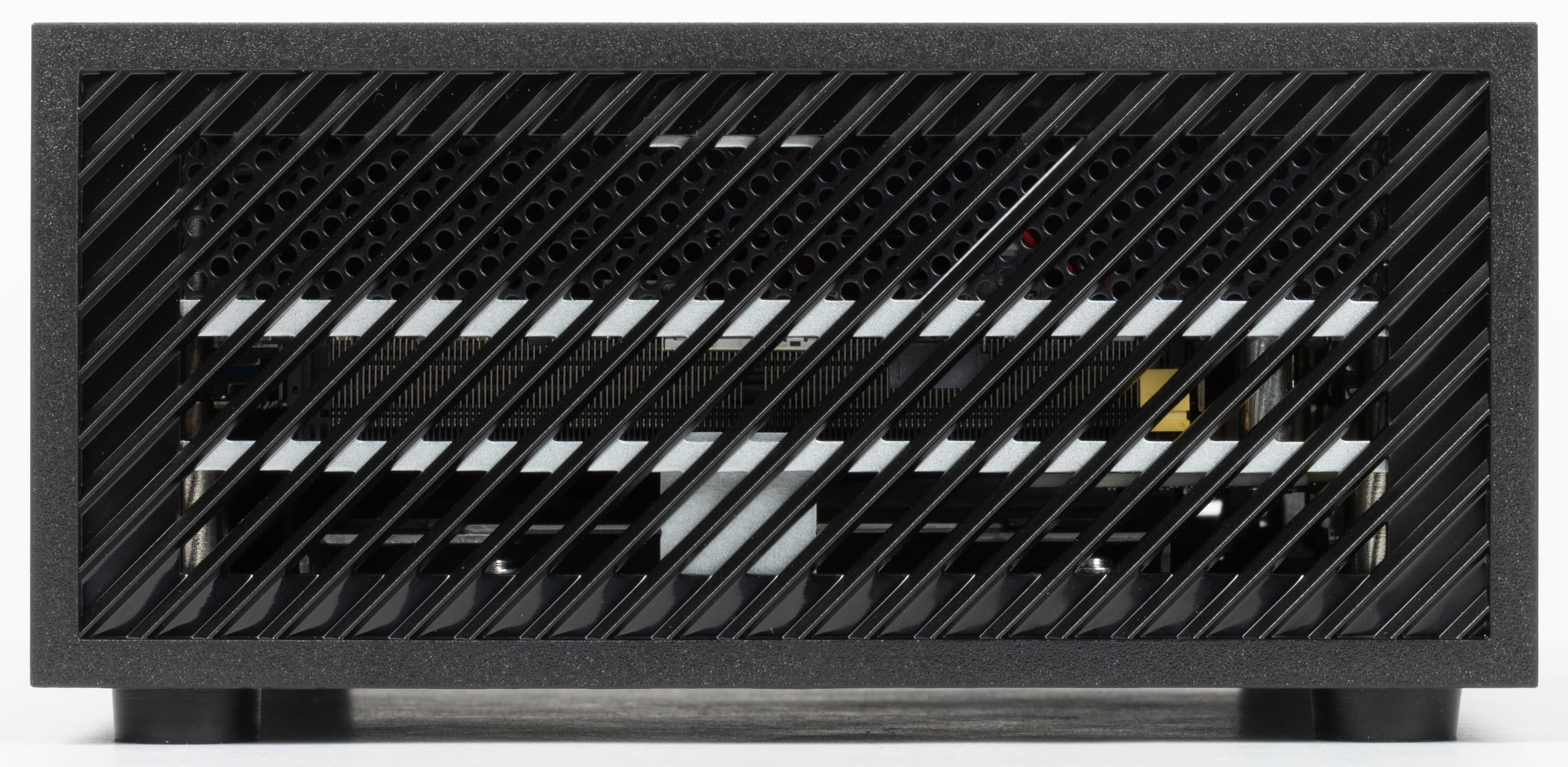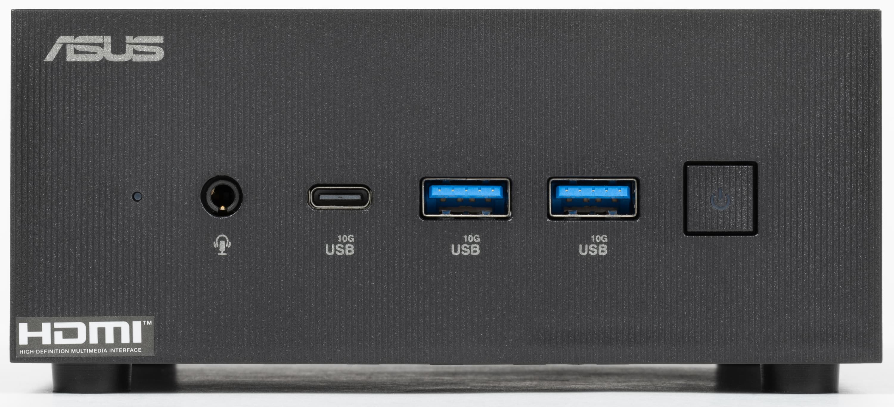 Передняя панель в новом поколении изменилась незначительно. Если бы производитель не привлекал особого внимания к тому, что скучные светодиоды дисковой активности и питания (был встроен в соответствующую кнопку) теперь заменены на многоцветный RGB, позволяющий отслеживать в том числе статус загрузки, это трудно было бы заметить. Остальные элементы — и вовсе без изменений. Здесь есть три порта USB 3.2 Gen2 — два «классических» Type-A и «модный» Type-C. В этом плане полное совпадение с PN64. В PN64-E1 же, напомним, формат USB-C имел разъем Thunderbolt 4, позволяющий получить скорость до 40 Гбит/с (если, конечно, найдется подходящее устройство).
