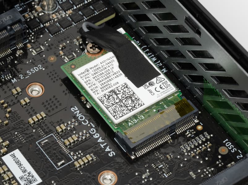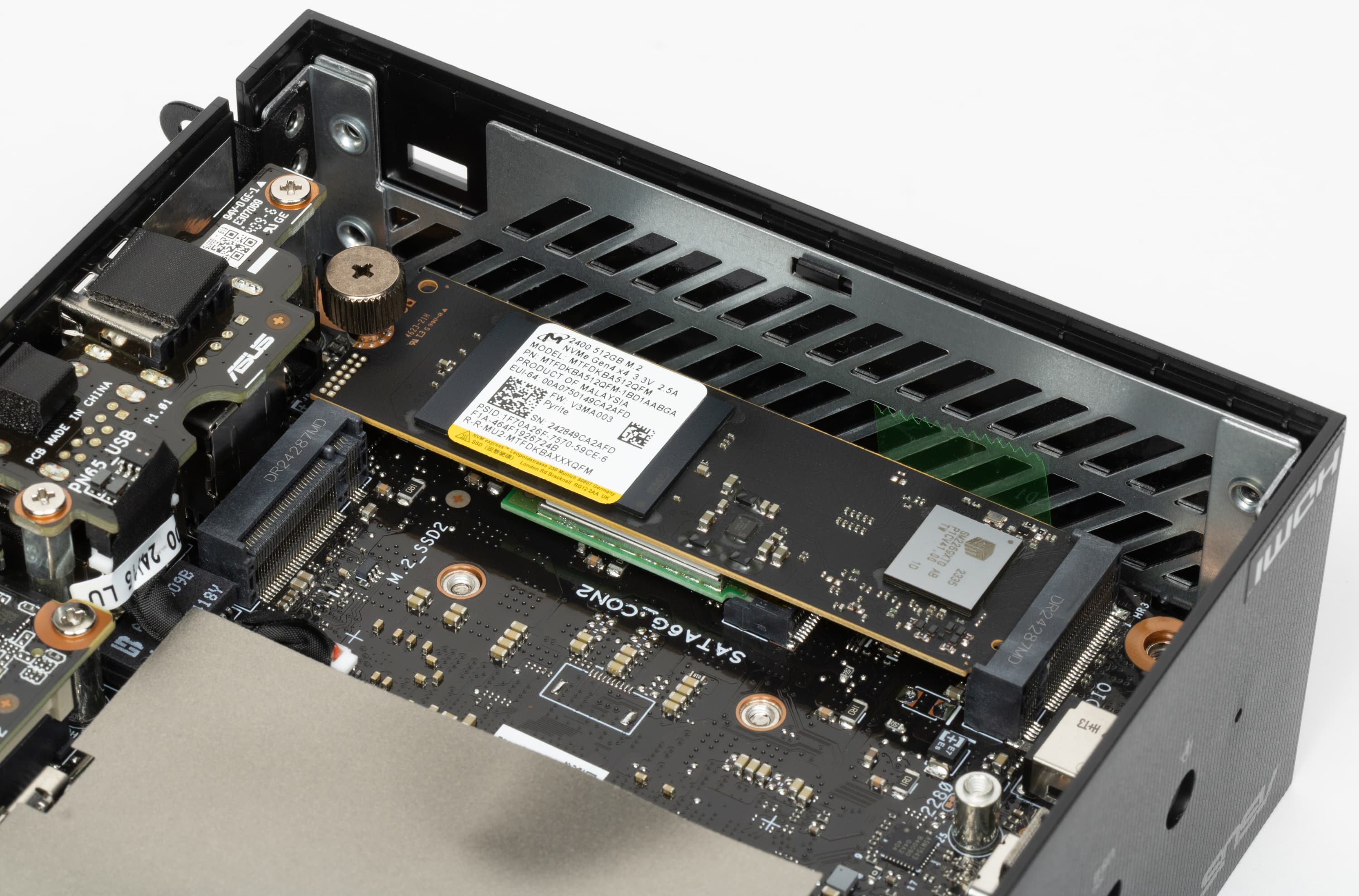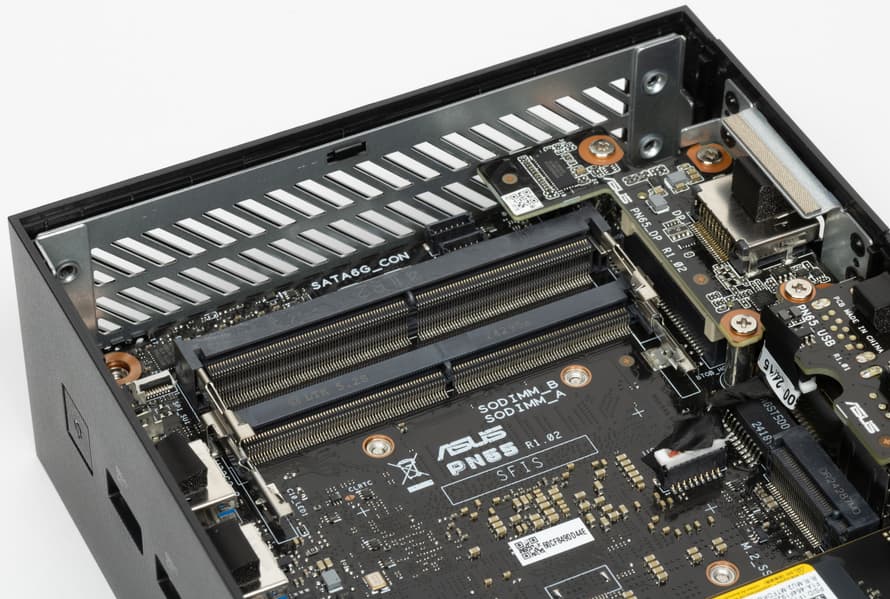 На месте осталась и поддержка двухдюймовых SATA-накопителей — благо Intel (в отличие от AMD) поддержку этого интерфейса пока из новых процессоров не убирает. Большого смысла в ней при покупке SSD «с нуля» уже нет, поскольку в продаже почти не осталось приличных моделей (недавно и Crucial MX500 покинул рынок вслед за многими), хотя кого-то может привлечь, например, Samsung 870 Qvo на 8 ТБ в качестве дополнительного накопителя. И не стоит забывать, что двухдюймовый диск (возможно, даже просто винчестер на пару терабайт) уже может иметься в наличии у покупателя, так что возможность его использовать однозначно порадует. В любом случае, до трех накопителей в ПК этого класса — редкость. У Asus такое ранее встречалось лишь в PN64-E1, но не в обычном PN64, так что PN65 — это шаг вперед.