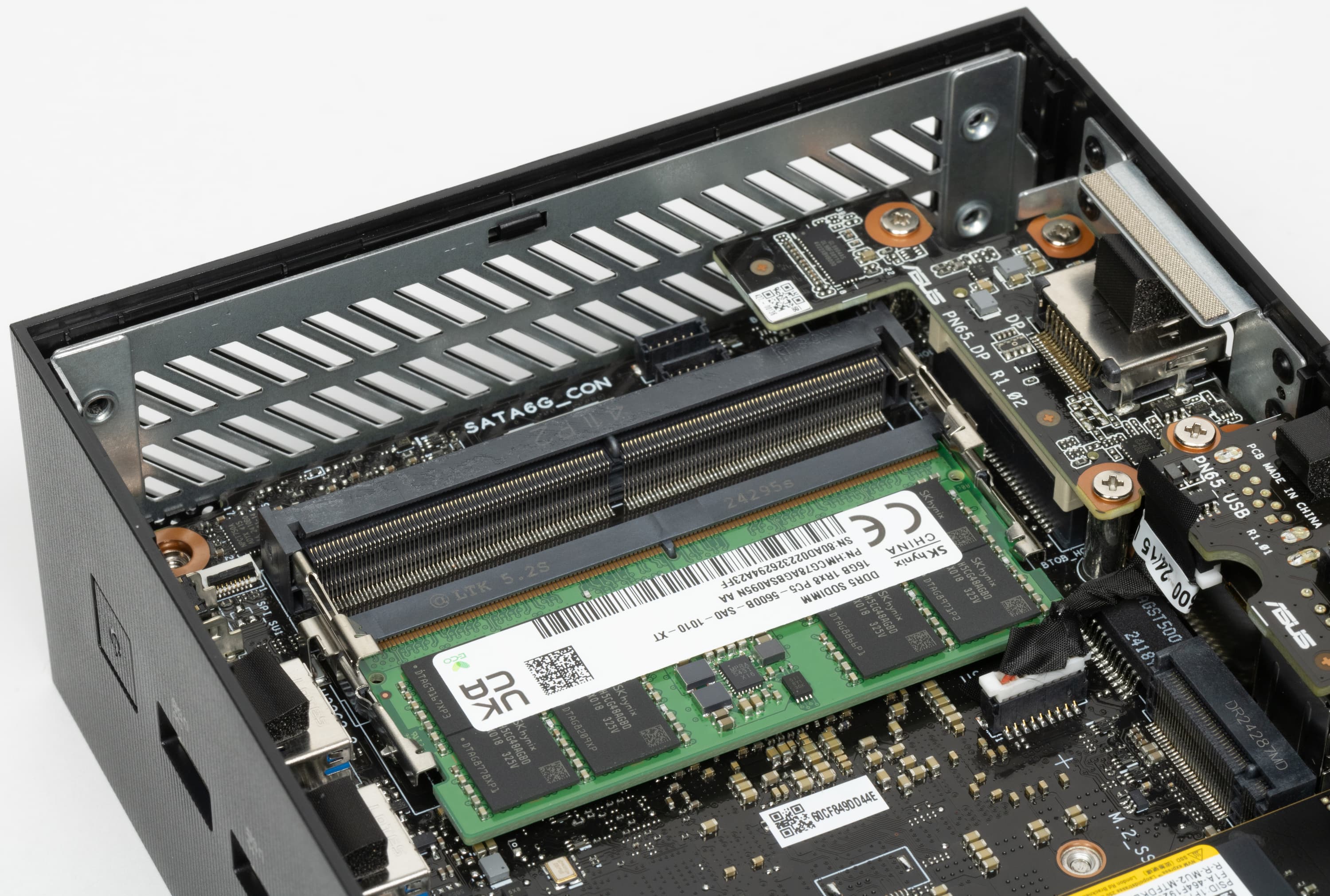 Многие мини-ПК предыдущих коллекций были рассчитаны на память DDR4 — в том числе и Intel NUC. Исключением можно было считать как раз Asus ExpertCenter, где использовалась DDR5. Сейчас же PN65 — просто один из многих, поскольку новые процессоры Intel не поддерживают DDR4. Зато и ситуация с доступностью модулей DDR5 за прошедшее время радикально изменилась.