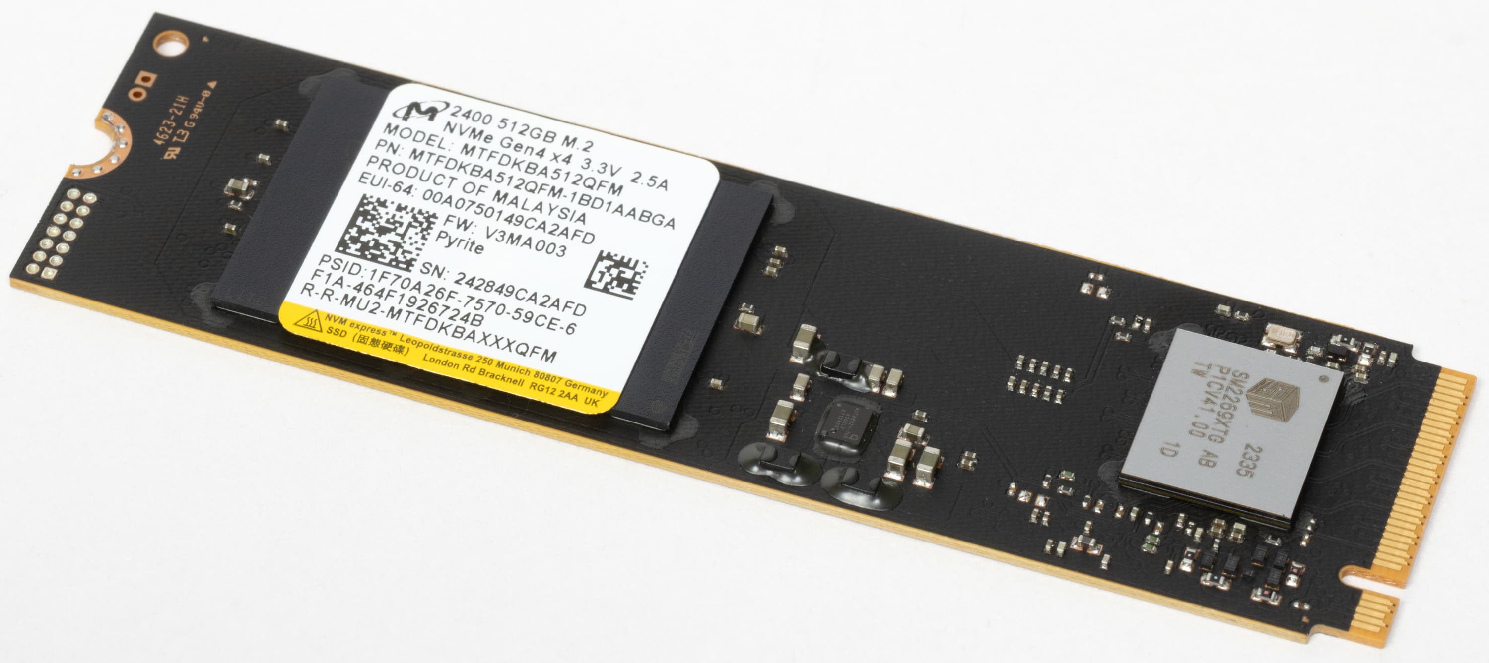 Мы бы рекомендовали что-нибудь сделать и с комплектным SSD. Ранее в Asus активно использовали Micron 2450, но сейчас этот SSD уже ушел в архив, так что в тестируемом компьютере был обнаружен... нет, не более новый Micron 2550, а Micron 2400. К сожалению, это две большие разницы: в линейках «с пятеркой» в третьей позиции используется TLC-память, а «с нулем» — QLC, что особенно неприятно при невысокой емкости. Контроллеры, естественно, в любом случае простые четырехканальные безбуферные. А компьютер все-таки претендует на нечто большее, чем простая пишмашинка — для той хватило бы и куда более простых (и дешевых!) процессоров.