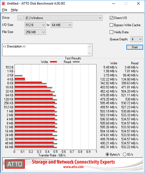 Утилита ATTO Disk Benchmark 4.00 определяет максимальную скорость его последовательного чтения на уровне примерно 535 МБ/с, а последовательной записи — на уровне примерно 505 МБ/с.