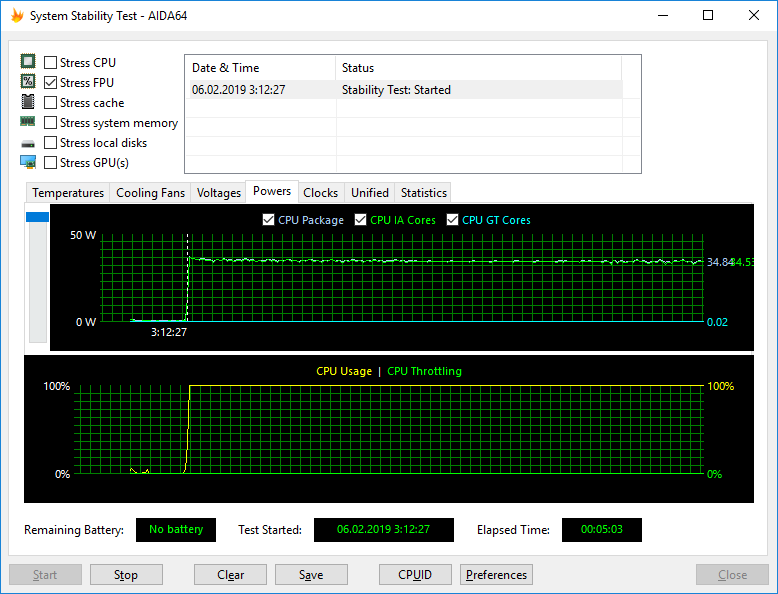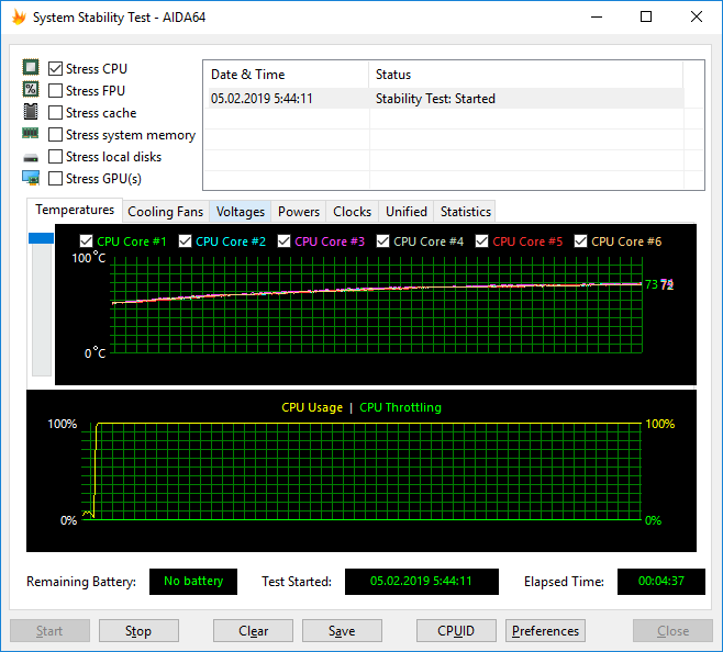 При этом температура процессора постепенно увеличивается до 75 °C, а мощность энергопотребления составляет 25 Вт.