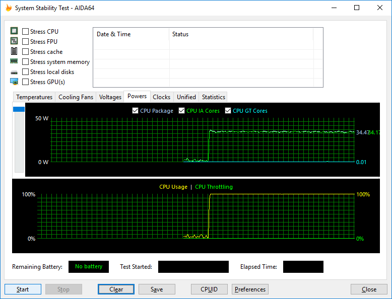 При высокой загрузке процессора с использованием теста Stress CPU из пакета AIDA64 тактовая частота ядер процессора составляет 3,2 ГГц.